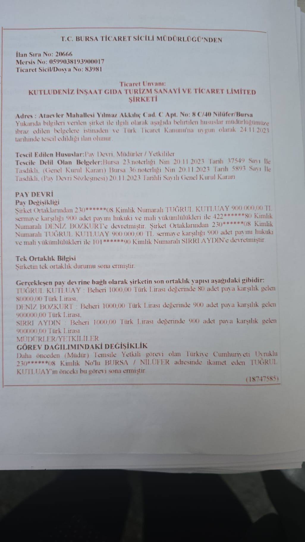 Bu yazının dipnotu: Tuğrul Kutluay, yurt dışına çıkmadan önce 2023 yılında hisse devrini Deniz Bozkurt ile Sırrı Aydın’a yapıyor. Bu dönemde Mustafa Bozbey ne Nilüfer Belediyesi başkanıdır ne de Bursa Büyükşehir başkanı…