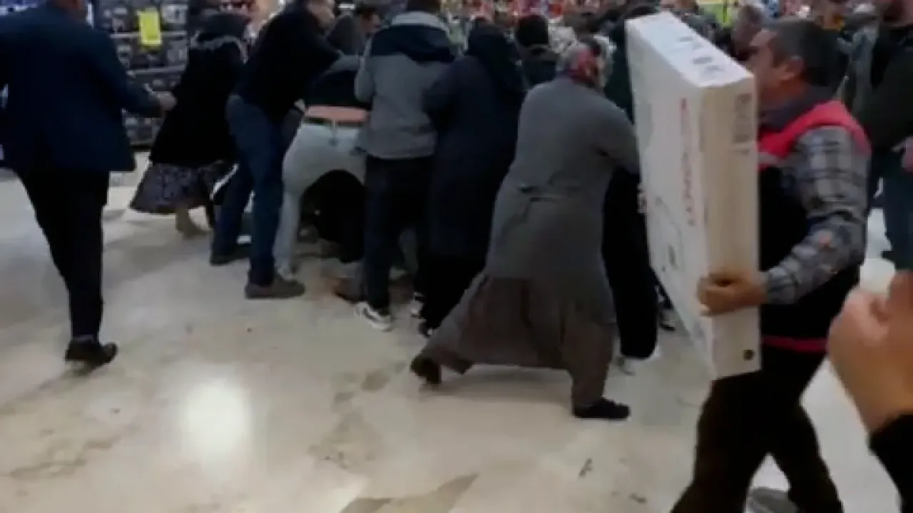 Market çalışanlarının kapıları açmasıyla içeriye giren kalabalık, sınırlı sayıdaki televizyonları alabilmek için birbiriyle yarıştı.
