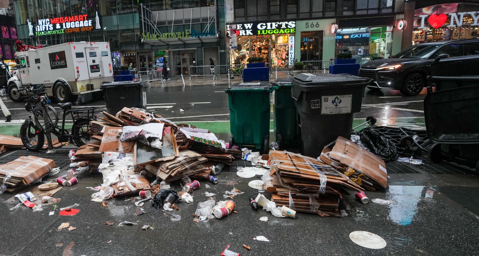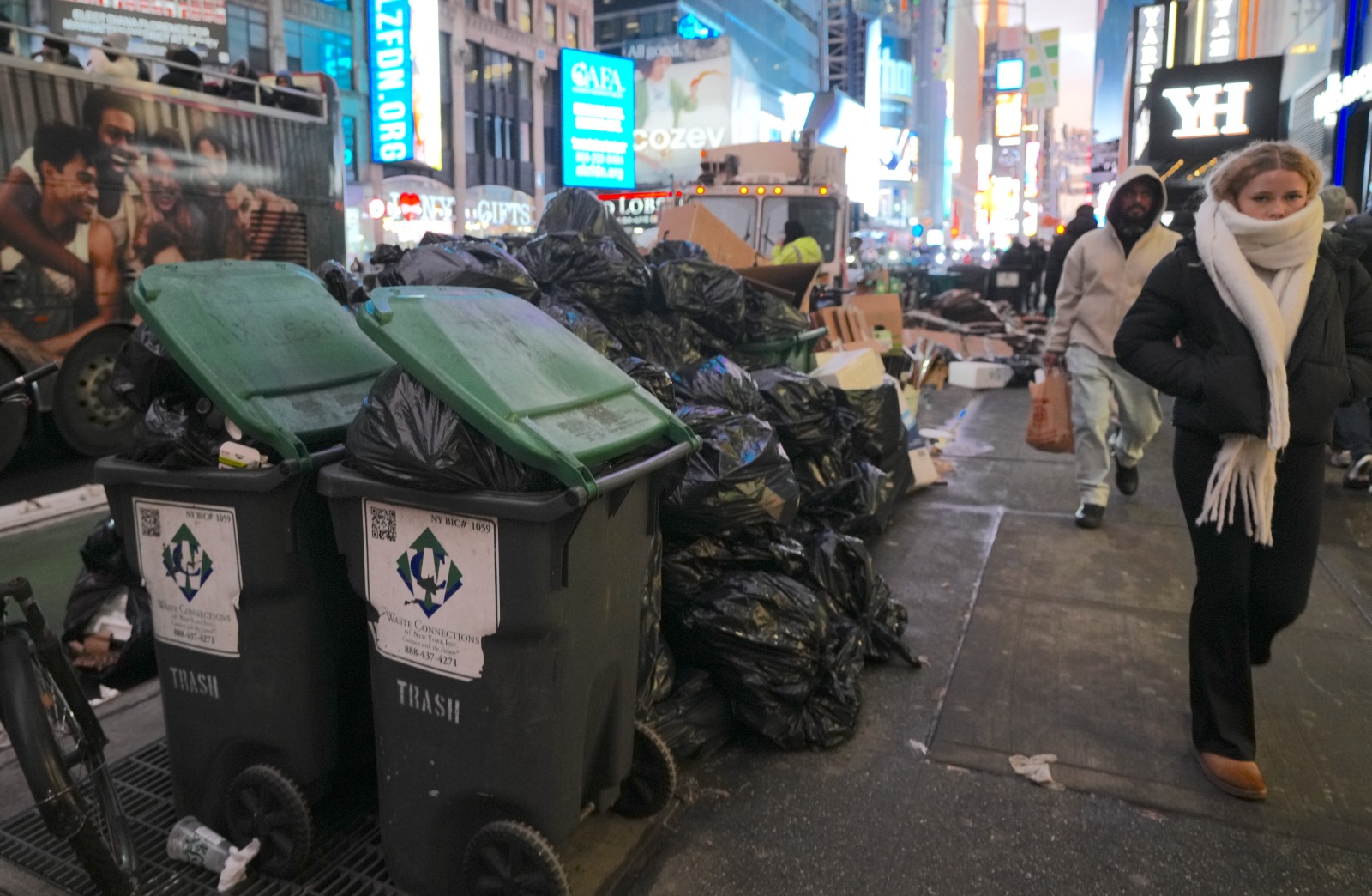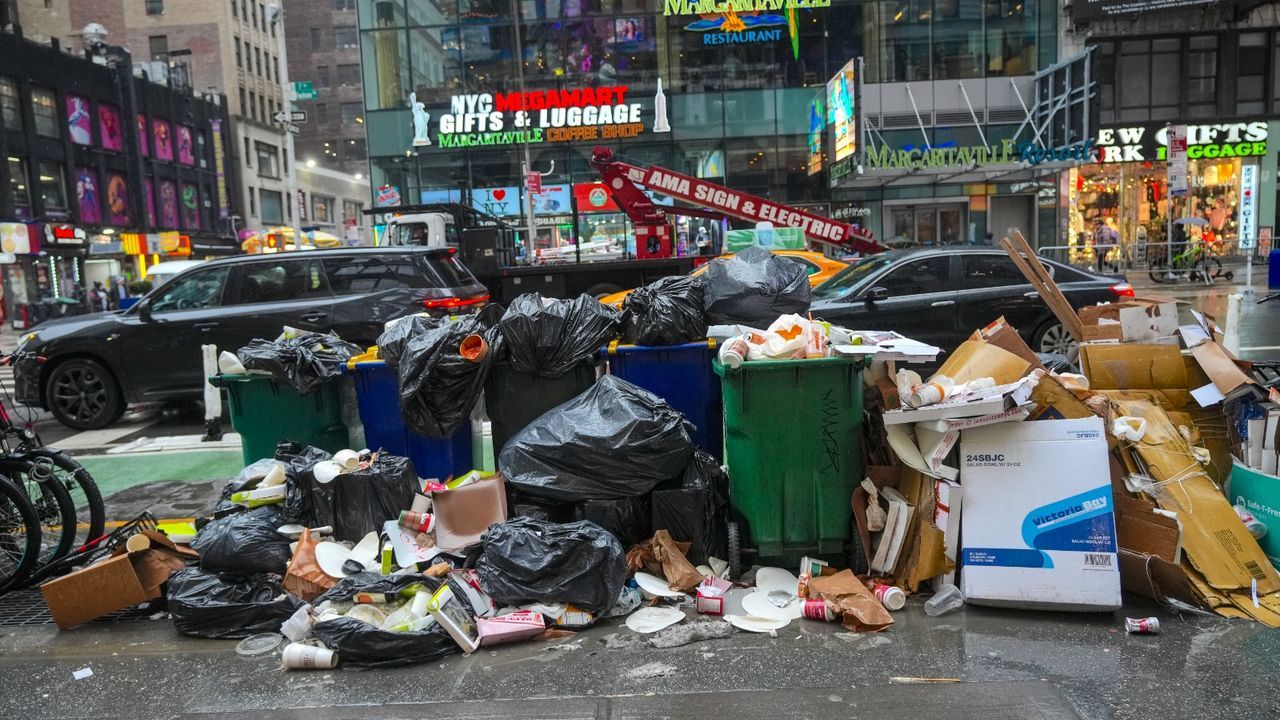 ABD’nin New York kentinde, yılbaşı kutlamalarına hazırlıkların sürdüğü Times Square’e yakın mesafedeki sokaklarda taşan çöp konteynerleri ve biriken atıklar dikkat çekti.