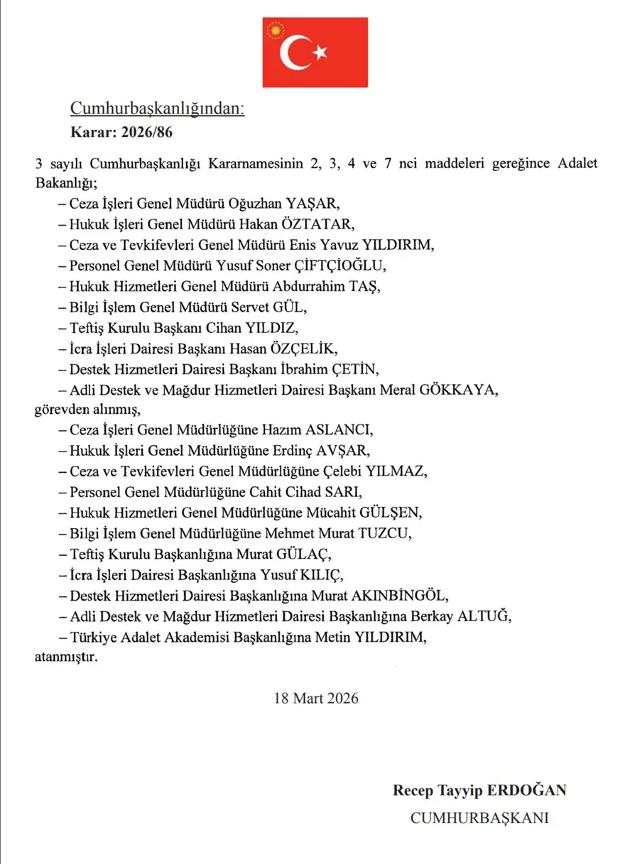 "Cumhurbaşkanımız Sayın Recep Tayyip Erdoğan'ın tensipleriyle Adalet Bakanlığımız bünyesinde yeni görevlerine atanan kıymetli çalışma arkadaşlarımızı tebrik ediyor, kendilerine üstün başarılar diliyorum.
