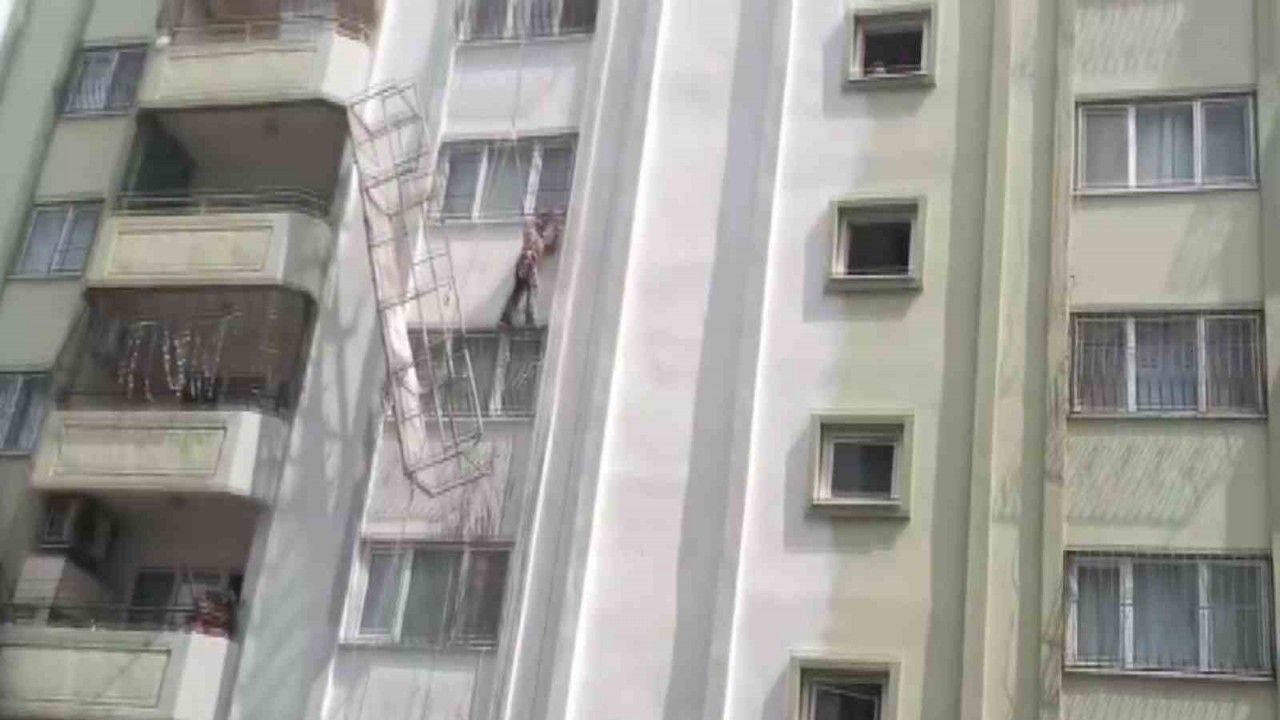 Adana’da cephe boyası yapan işçi, iskelenin halatının kopmasıyla metrelerce yüksekte asılı kaldı. Korku dolu anlar cep telefonu kamerasına yansırken, itfaiye ekipleri işçiyi kurtardı.