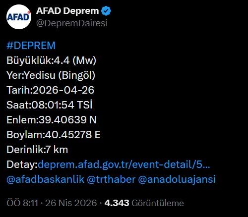 Depremin merkez üssünün Bingöl'ün Yedisu ilçesi olduğu öğrenildi. AFAD depremin derinliğinin 7 kilometre olarak ölçüldüğünü açıkladı.