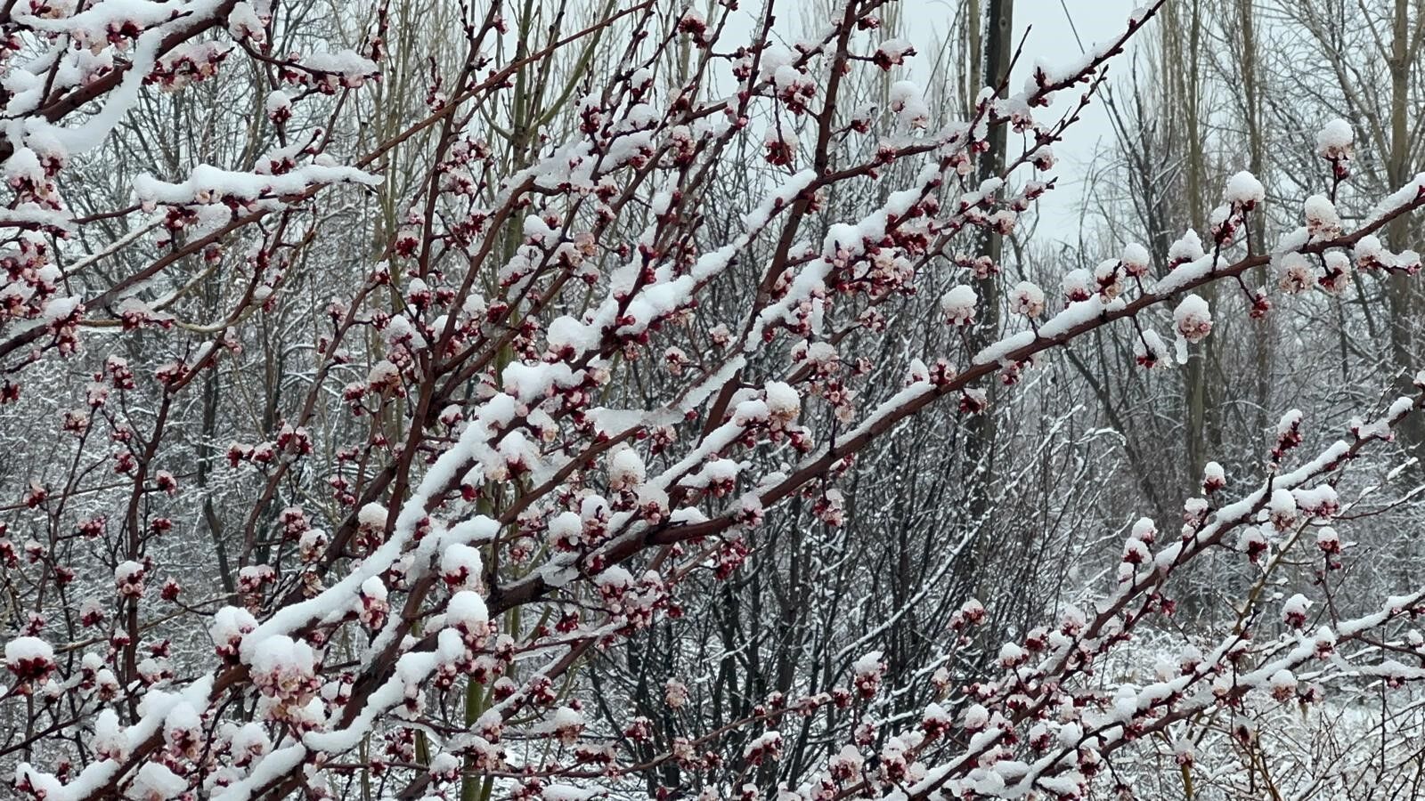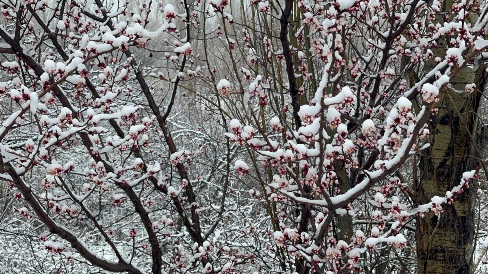 Bir süredir bahar havasının hakim olduğu iç Batı Anadolu kentlerinde çiçek açan badem ve kayısı ağaçları da karla kaplandı. Baharla açan beyaz ve pembe renkli çiçekler tam doğayı renklendirmişken karla beyaza büründü.
