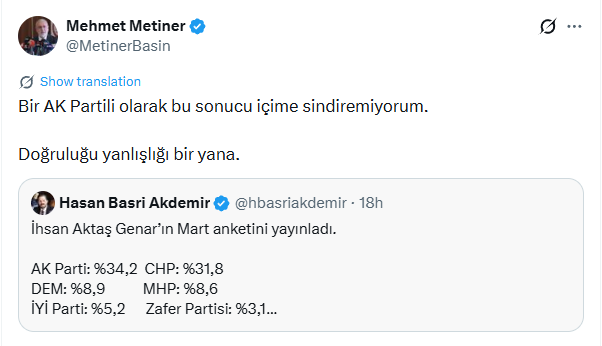 Metiner, partisinin birinci çıktığı bir tabloya yönelik rahatsızlığını şu sözlerle dile getirdi: "Bir AK Partili olarak bu sonucu içime sindiremiyorum. Doğruluğu yanlışlığı bir yana."