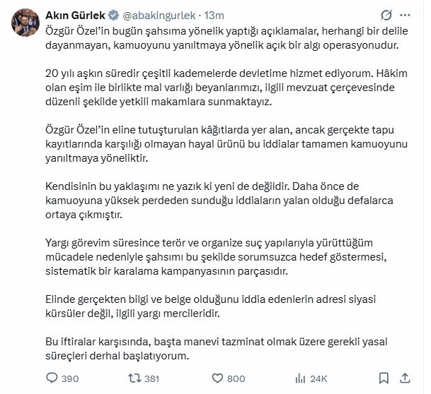 Yargı görevim süresince terör ve organize suç yapılarıyla yürüttüğüm mücadele nedeniyle şahsımı bu şekilde sorumsuzca hedef göstermesi, sistematik bir karalama kampanyasının parçasıdır.