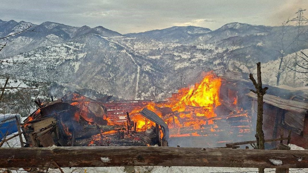 Karabük'ün Yenice ilçesinde alevlere teslim olan ahşap ev tamamen yanarak kullanılmaz hale geldi.