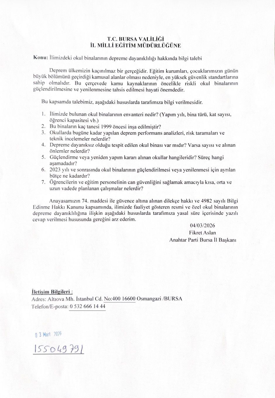 Anahtar Parti yöneticileri dilekçelerinde, Bursa'daki okul binalarının mevcut durumu hakkında detaylı bilgi talep etti. Bu kapsamda; il genelindeki okul binalarının envanteri, kaç tanesinin 1999 yılı öncesinde inşa edildiği, bugüne kadar yapılan deprem performans analizleri ve risk taramaları soruldu.