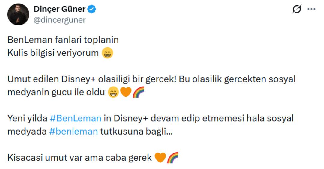 Ünlü astrolog aldığı kulis bilgisini paylaşarak" Umut edilen Disney+ olasılığı bir gerçek! Bu olasılık gerçekten sosyal medyanın gücü ile oldu. Yeni yılda Ben Leman'ın Disney+ devam edip etmemesi hâlâ sosyal medyada Ben Leman tutkusuna bağlı" dedi.