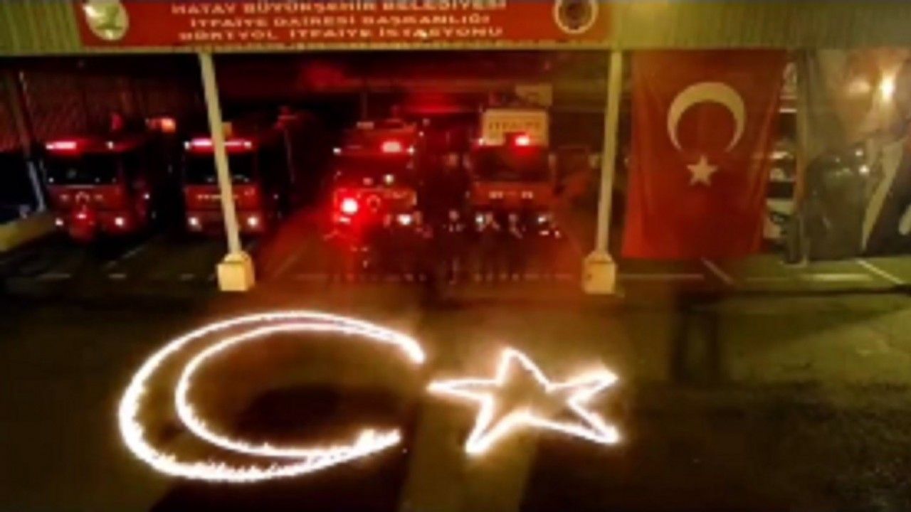 Hatay Büyükşehir Belediyesi İtfaiye Daire Başkanlığı’na bağlı Dörtyol itfaiye istasyonunda görevli ateş savaşçıları, 29 Ekim Cumhuriyet Bayramını alevlerle kutladılar. İtfaiye personelleri, ay ve yıldızla oluşturdukları görseli ateşe vererek sosyal medya üzerinden kutlama mesajı yayınladılar. İstasyon alanı önünde alevlerle oluşturdukları ay yıldızlı hilal geceyi aydınlatırken görsel şölene dönüştü.