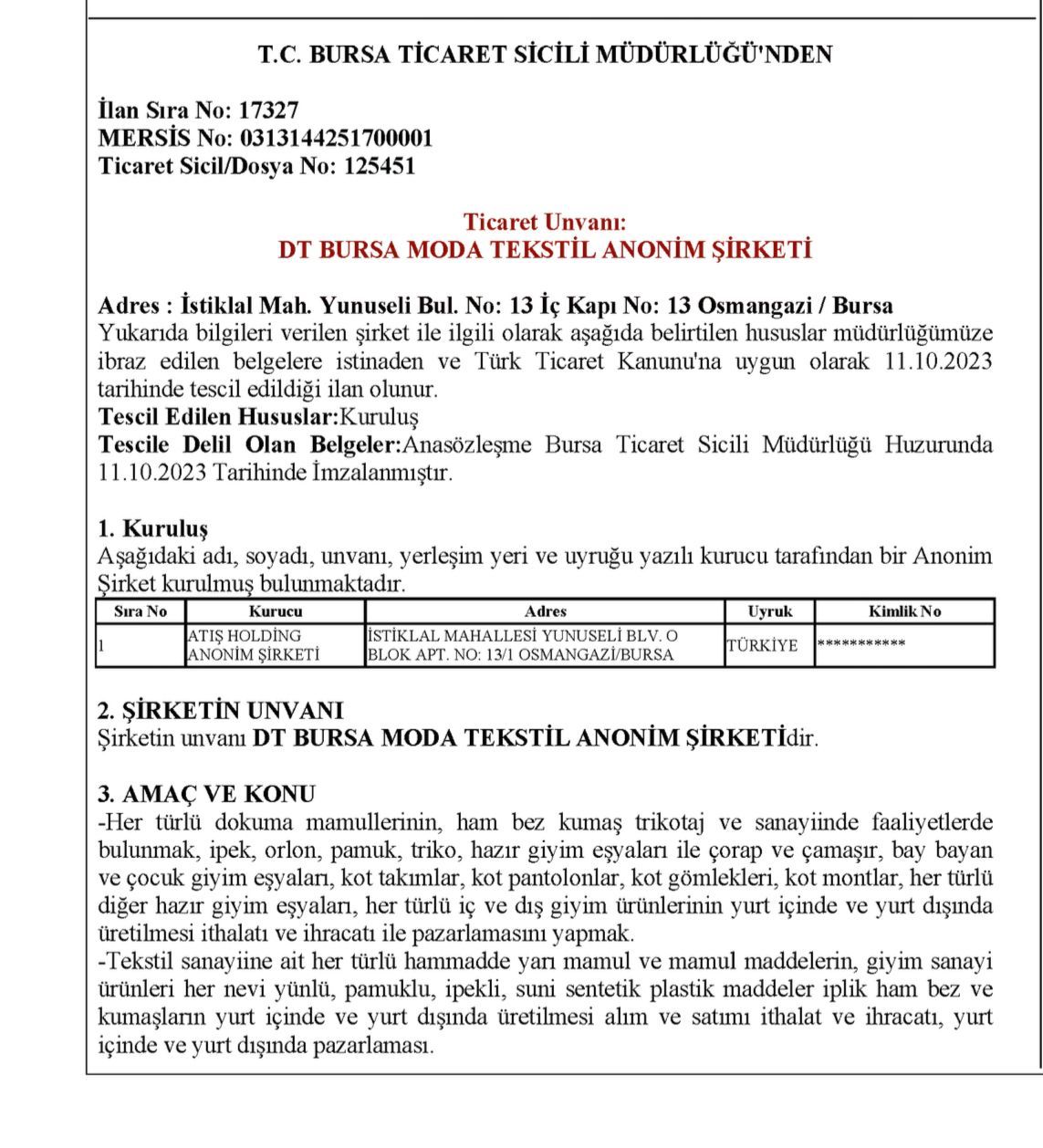 Bu noktada bir başka tam teyit edemediğim bir bilgi ortaya çıktı. Beşiktaş Ortaköy’de Atış Yapı’nın bir başka kuruluşu, DT Bursa Moda Tekstil Anonim Şirketi üzerindeki dairenin satış işleminin yapılmakta olduğu öğrenildi.