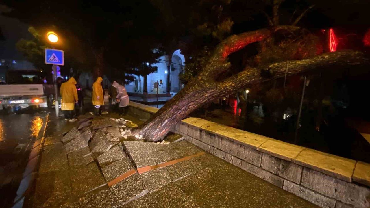 Aydın'ın Efeler ilçesi kent merkezinde Bey Camii önündeki kaldırımda bulunan çam ağacı gün boyu etkili olan sağanak yağmur nedeniyle devrilirken, gece saatlerinde yolun boş olması muhtemel bir facianın önüne geçti.