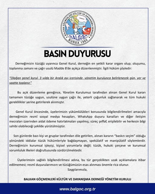 Balkan Göçmenleri Kültür ve Dayanışma Derneği (BAL-GÖÇ) Yönetim Kurulu, genel kurul süreciyle ilgili kamuoyunda oluşan tartışmalar üzerine bir basın duyurusu yayımladı. Açıklamada, dernek tüzüğünün 8. maddesi uyarınca genel kurulun üç yılda bir Aralık ayı içerisinde yapılacağı, yer ve saatin yönetim kurulu tarafından belirleneceğinin açıkça düzenlendiği hatırlatıldı.