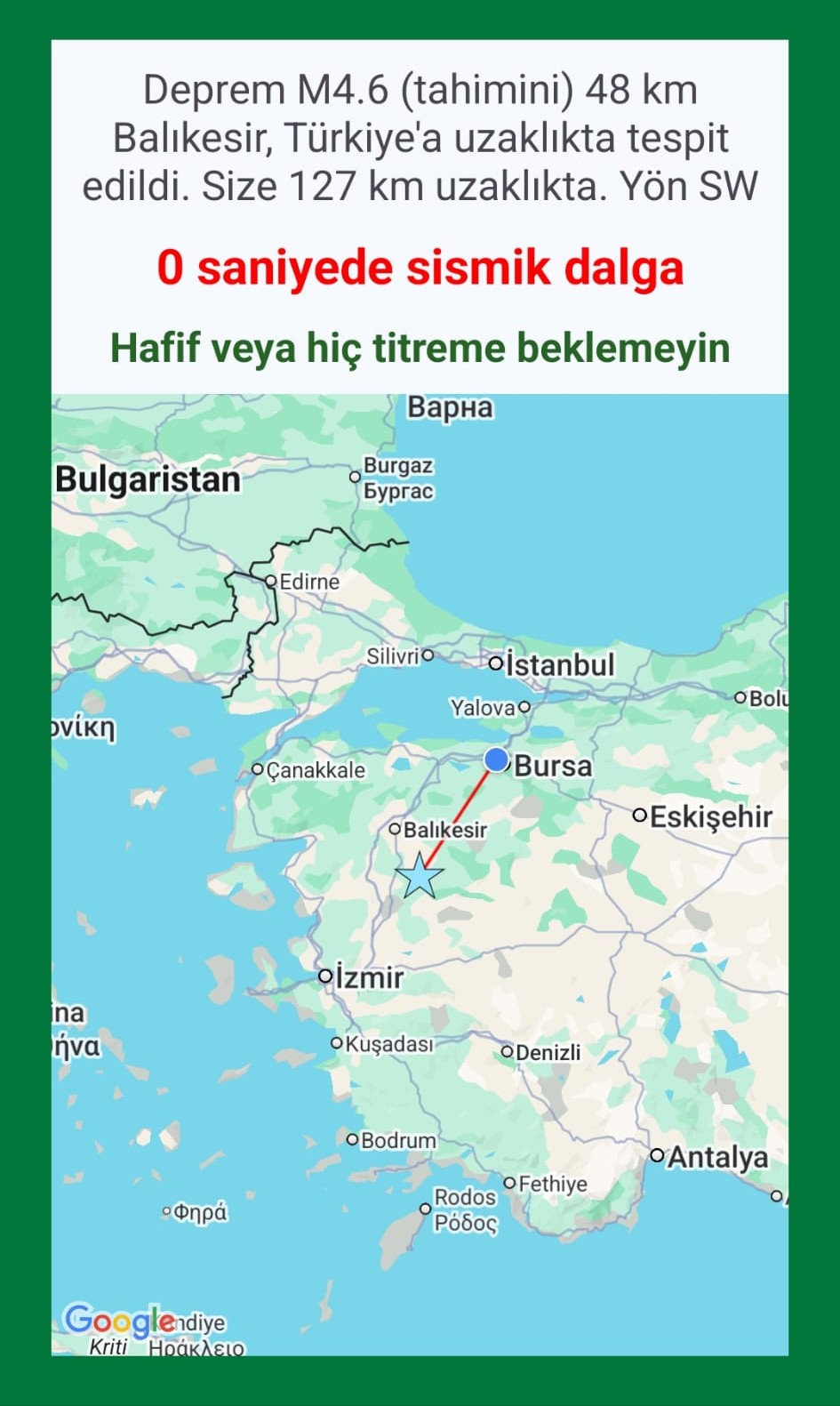 Edinilen bilgiye göre, Balıkesir'de 4.6 büyüklüğünde bir deprem meydana geldi.