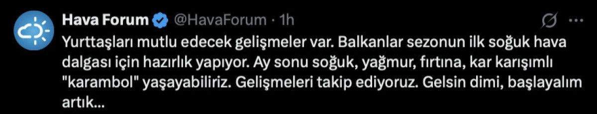 “Yurttaşları mutlu edecek gelişmeler var. Balkanlar sezonun ilk soğuk hava dalgası için hazırlık yapıyor. Ay sonu soğuk, yağmur, fırtına, kar karışımlı "karambol" yaşayabiliriz. Gelişmeleri takip ediyoruz. Gelsin dimi, başlayalım artık…”