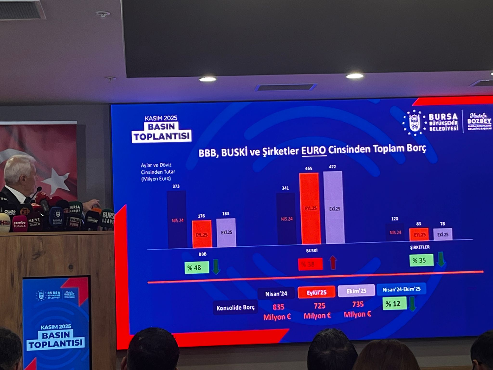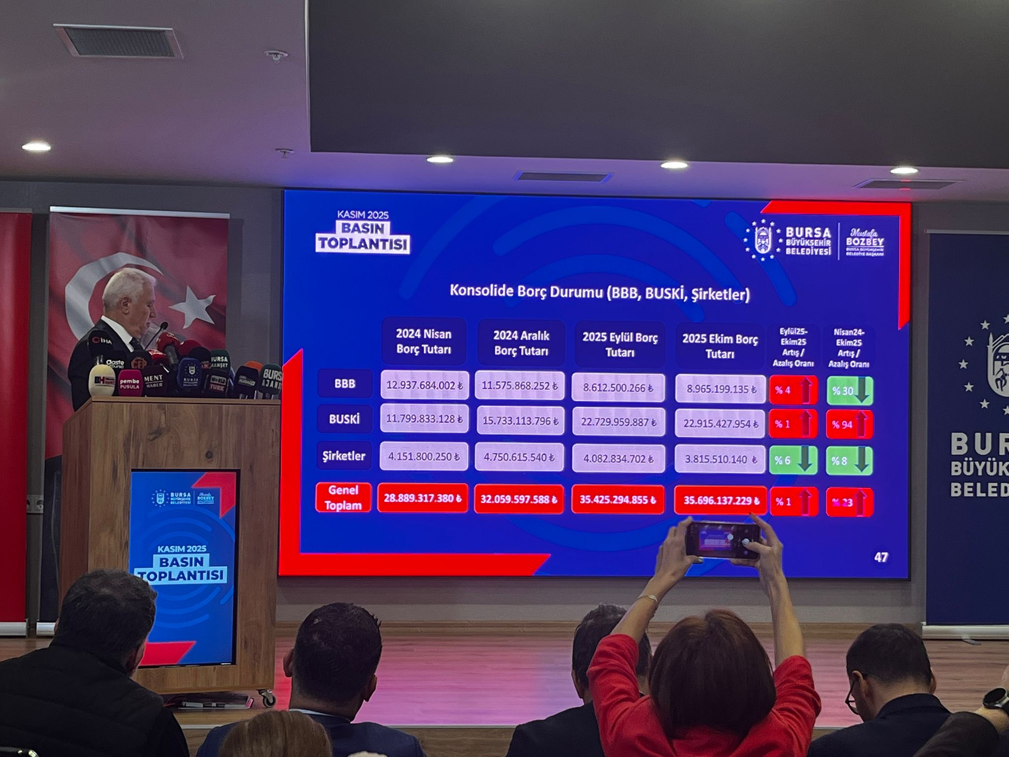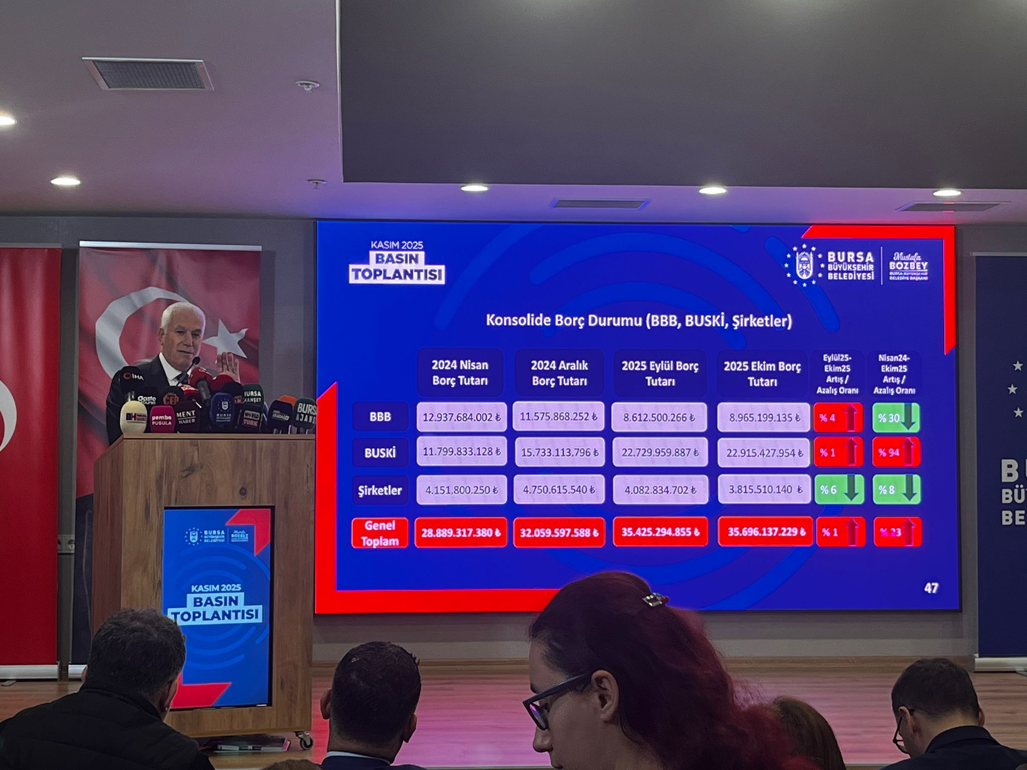 Bursa Büyükşehir Belediye Başkanı Mustafa Bozbey, Kasım Ayı Değerlendirme toplantısında BBB ve Buski’ye ait borç durumunu açıkladı.
