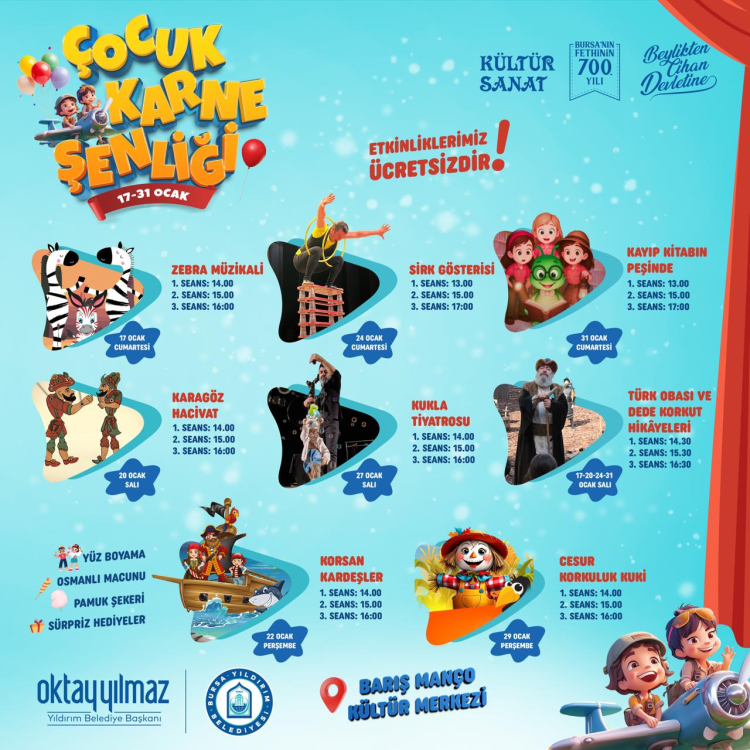 Yıldırım Belediyesi Kültür Sanat ve Sosyal İşler Müdürlüğü tarafından düzenlenen Karne Şenliği, 17-31 Ocak tarihleri arasında Barış Manço Kültür Merkezi'nde gerçekleştirilecek. Şenlik kapsamında çocuklar için birbirinden eğlenceli etkinlikler ücretsiz olarak sunulacak.