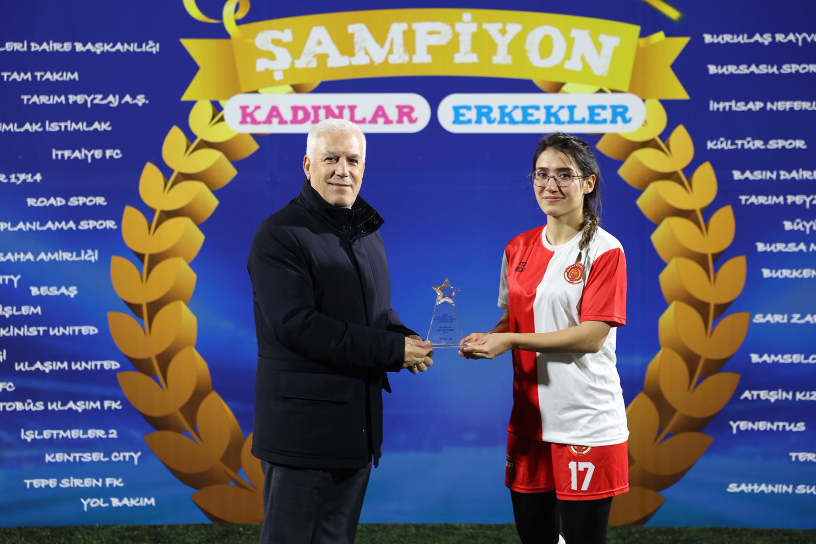 Bursa’da kültürden sanata, altyapıdan ulaşıma kadar birçok alanda çalışmalarını sürdüren Büyükşehir Belediyesi, personelin motivasyonunu artırmak amacıyla sosyal faaliyetlerini de sürdürüyor. Bu kapsamda Gençlik ve Spor Hizmetleri Dairesi Başkanlığı aracılığıyla ‘9. Başkanlık Kupası Personel Futbol Turnuvası’ düzenlendi. Bursa Büyükşehir Belediyesi ve tüm iştiraklerin katılımıyla Merinos Stadyumu’nda yapılan turnuvada, 49 erkek ve 3 kadın takımı olmak üzere toplam 52 takım kıyasıya mücadele etti. Turnuvaya yaklaşık 800 personel katılırken, turnuvanın kadınlar finalinde ‘Ateşin Kızları’ (İtfaiye Dairesi Başkanlığı) kupanın sahibi oldu. Turnuvada ikinciliği ‘Sahanın Sultanları’ (Zabıta Dairesi Başkanlığı), üçüncülüğü ‘Su Perileri’ (BUSKİ) elde etti.