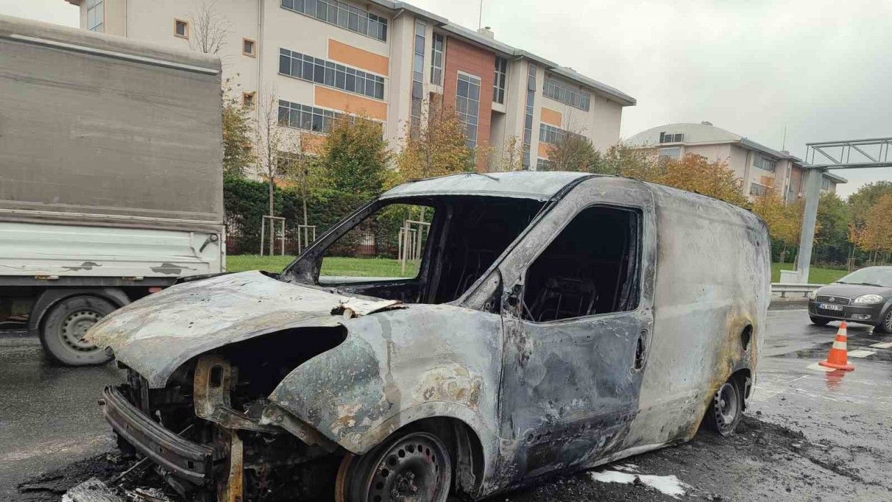 Bayrampaşa’da seyir halinde alev alev yanan araçtan geriye demir yığını kaldı.