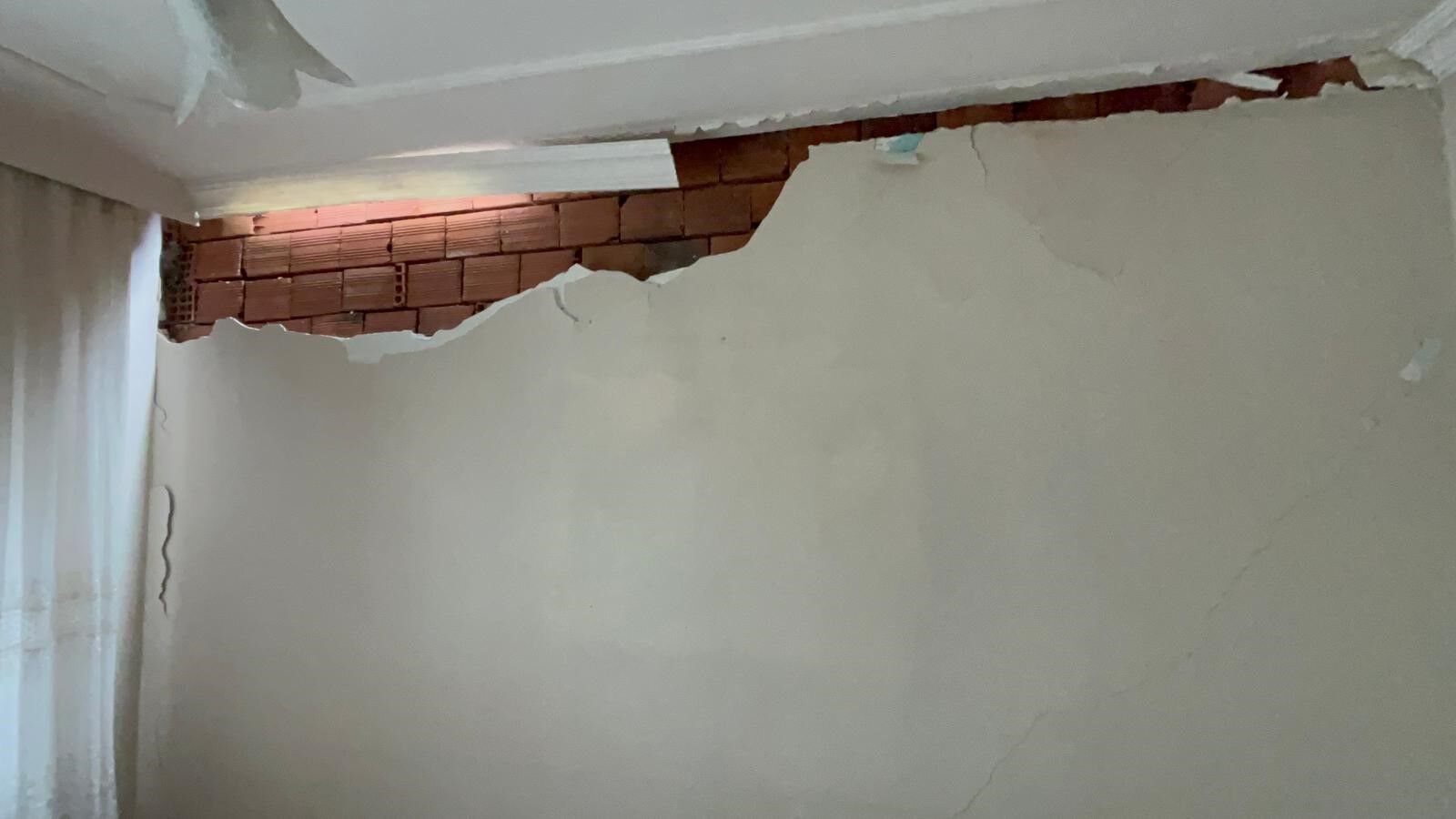 Yine ekskavatörün darbesi ile yaşlı çiftinin bahçe duvarı da hasar alırken, yıkılma ihtimali bulunan bahçedeki duvarın geriye kalan kısımları korkuttu. Patlayan şebeke suyu sonrası evin bodrum katına su dolarken, duvarı yıkılan salondan içeri ise moloz yığınları döküldü. Durum karşında şok olan ve o esnada evde bulunan 73 yaşındaki Emine Aydoğan, ne yapacağını bilemediğini anlattı.