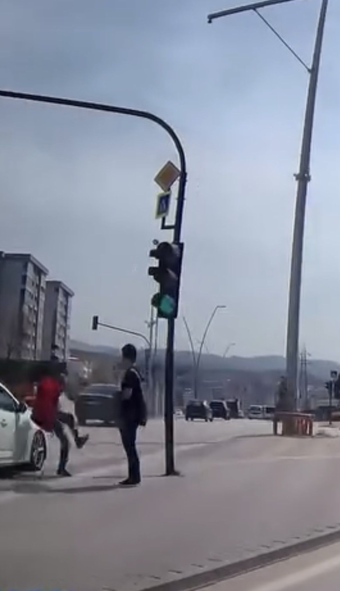Bursa'nın Nilüfer ilçesinde trafik ışıklarının araçlara yeşil yandığı sırada karşıya geçmek isteyen bir yaya, akan trafiğe aldırış etmeden yola çıktı.