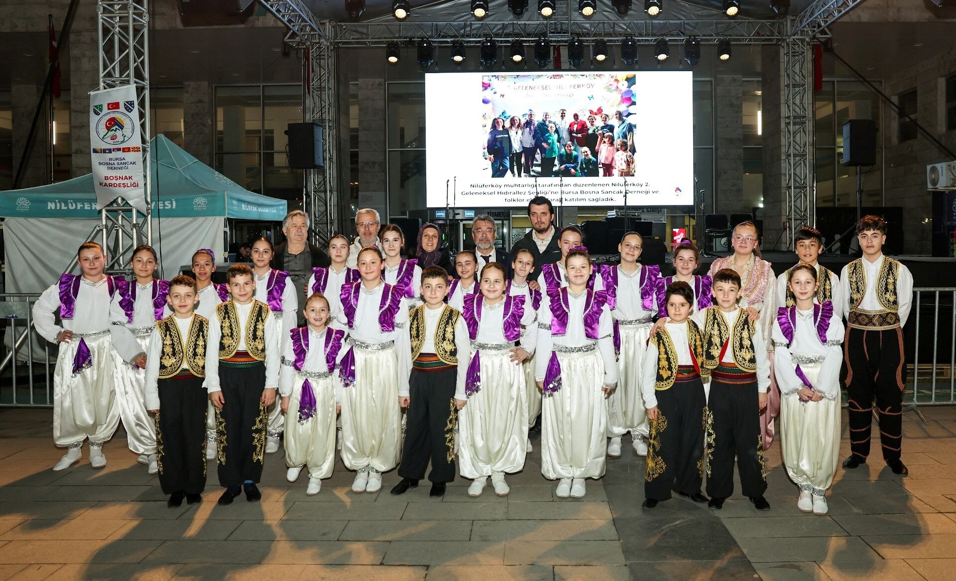 Gecede, Bursa Bosna Sancak Yardımlaşma Dayanışma ve Kültür Derneği'nin gençlerden oluşan folklor ekibi sahne aldı. Balkanların zengin müzik kültürlerinden örnekler sunan ekip, şarkıların ardından sergiledikleri yöresel dans performanslarıyla da alanı dolduran izleyicilerden tam not aldı.