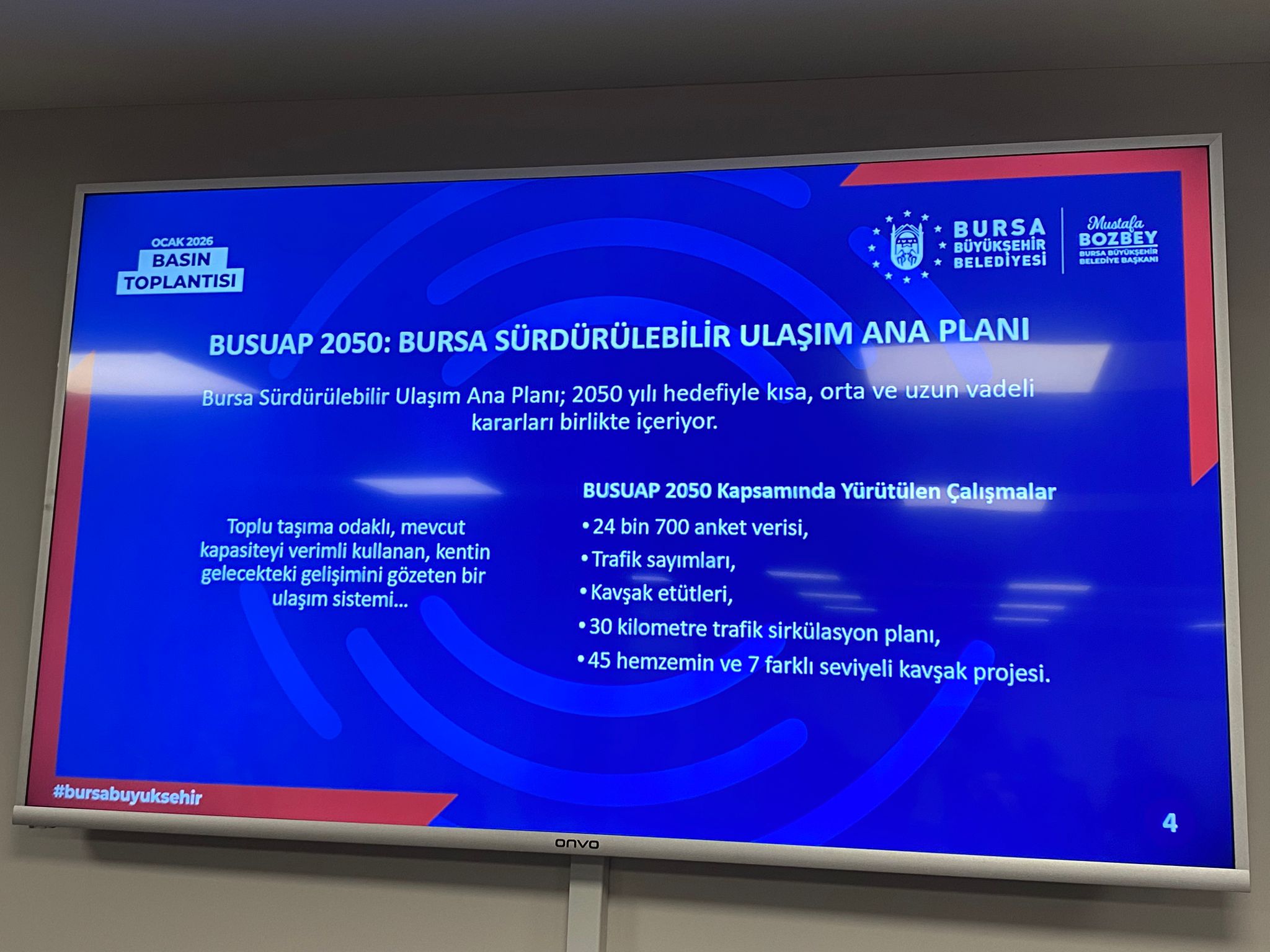 Bozbey, BUSUAP 2050’nin toplu taşıma odaklı, mevcut kapasiteyi verimli kullanan ve kentin gelecekteki gelişimini gözeten bir ulaşım sistemi hedeflediğini ifade etti.