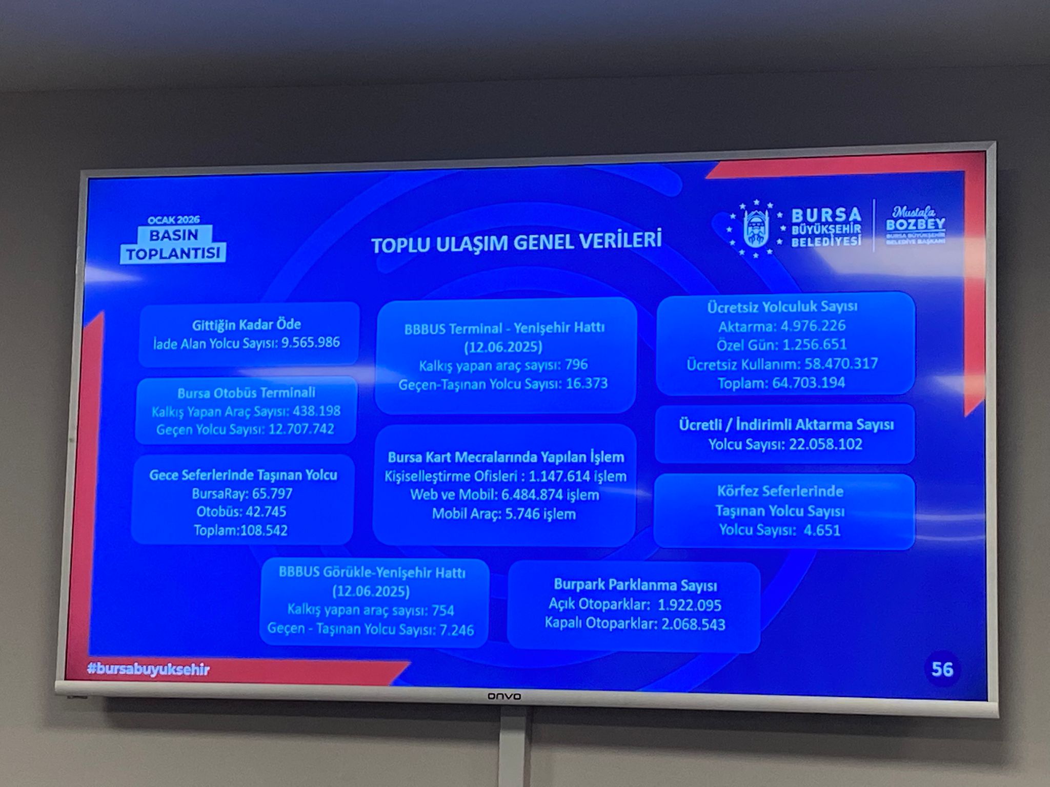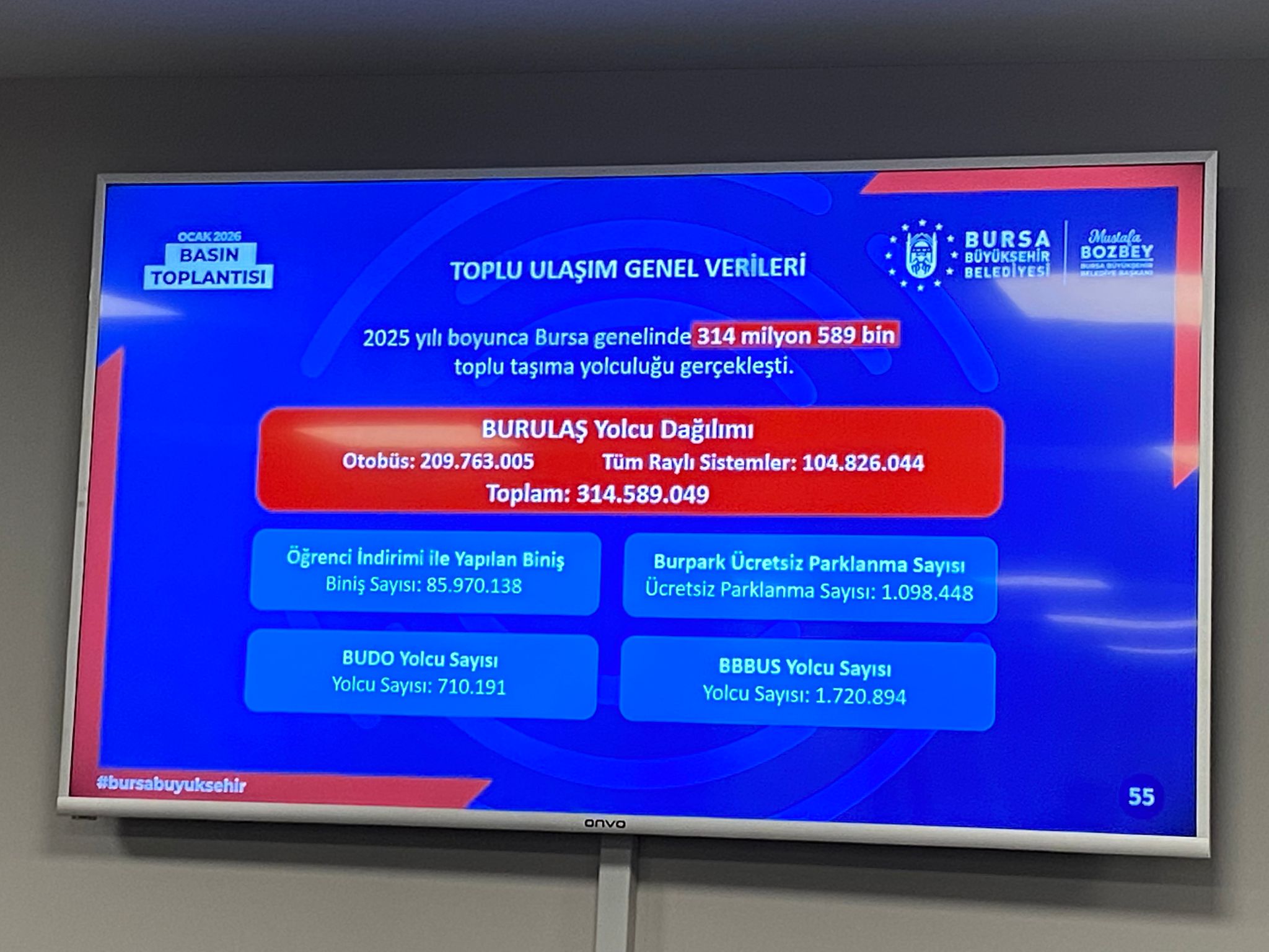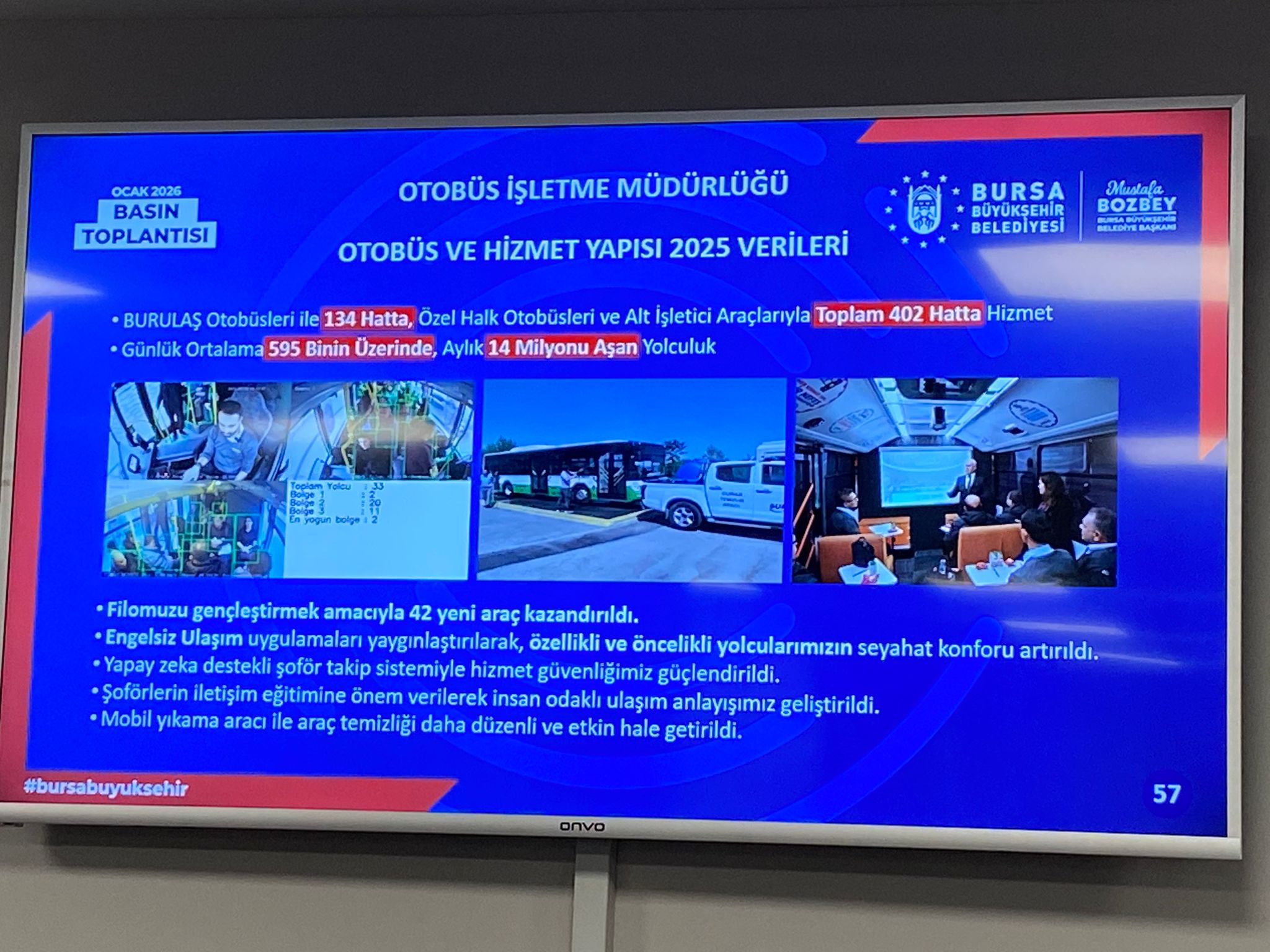 Bursa Büyükşehir Belediyesi’nin Ocak ayı değerlendirme toplantısında konuşan Büyükşehir Belediye Başkanı Mustafa Bozbey, 2026 yılında ulaşım alanında hayata geçirilecek projeleri basına tanıttı. Bozbey, otobüs, tramvay ve bisiklet gibi alternatif ulaşım araçlarının geliştirilmesiyle karbon ayak izinin azaltılmasının hedeflendiğini söyledi.