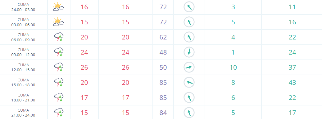 Akşam saatlerinden itibaren yağışların etkisini kaybetmesiyle birlikte hava parçalı bulutlu olacak. Sıcaklık gece saatlerinde 18 dereceye kadar düşecek.
