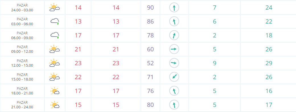 Öğle saatlerinden itibaren sıcaklık artarak 22-24 dereceye yükselecek. Akşam saatlerinde ise sıcaklık yeniden düşüşe geçerek 16-17 derece civarında seyredecek.
