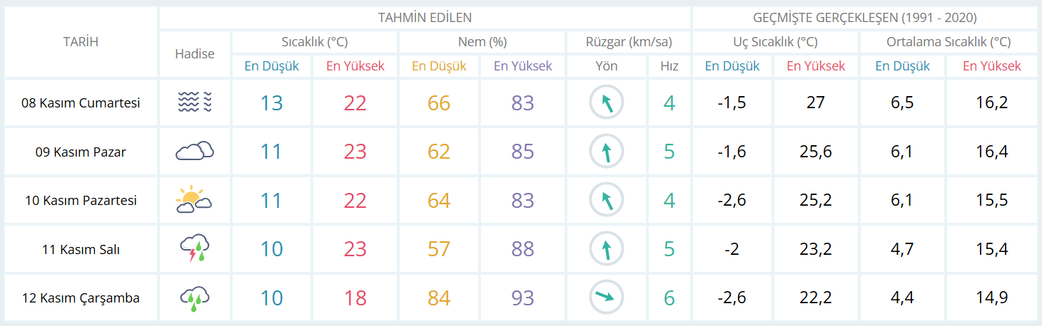 8 Kasım Cumartesi günü sabah saatlerinde yer yer sis ve pus etkili olacak. Gün içinde sıcaklık 23 dereceye kadar yükselirken, akşam saatlerinden itibaren kısa süreli yağmur geçişleri bekleniyor.