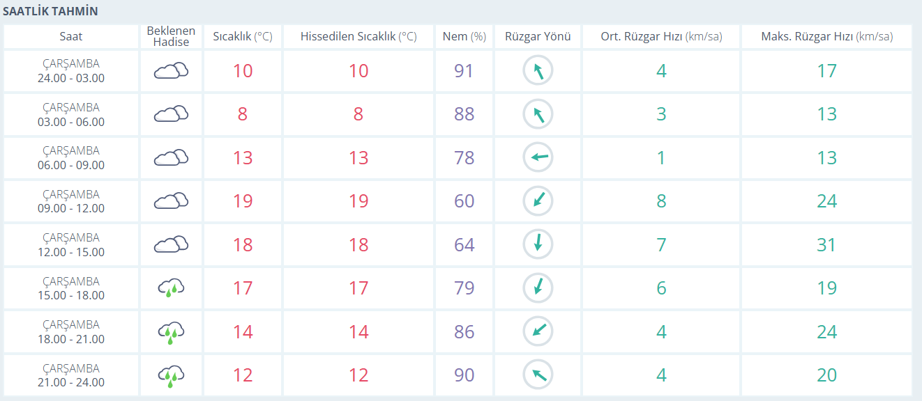 Bursa için yayımlanan son hava tahminlerine göre şehirde hafta ortası itibarıyla parçalı bulutlu başlayan hava, günün ilerleyen saatlerinde yerini yağışa bırakıyor. Çarşamba günü gece saatlerinde 10 derece civarında seyreden sıcaklık, sabah saatlerinde 8 dereceye kadar geriliyor. Gün içinde ise hava 19 dereceye kadar ısınırken nem oranı yüksek seviyelerde kalmayı sürdürüyor. Öğleden sonra itibarıyla yağmur etkisini göstermeye başlıyor ve akşam saatlerine doğru yağışın yer yer kuvvetlenmesi bekleniyor. Rüzgar gün boyunca hafif ve orta şiddette eserken, zaman zaman saatte 30 kilometreye yaklaşan hamleler görülebiliyor.