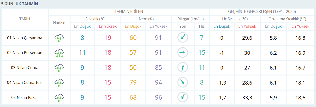Beş günlük projeksiyona bakıldığında Bursa’da yağışlı sistemin etkisini sürdürdüğü görülüyor. Nisan ayının ilk günü en düşük 8, en yüksek 19 dereceyle geçerken, perşembe günü sıcaklıklar 11 ile 18 derece arasında değişiyor ve yağışın daha belirgin olması bekleniyor. Cuma günü de benzer şekilde yağmurlu bir hava öngörülürken sıcaklıklar 9 ila 18 derece aralığında seyrediyor. Hafta sonuna doğru sıcaklıklarda bir miktar düşüş dikkat çekiyor; cumartesi günü en yüksek sıcaklık 15 dereceye kadar gerilerken, pazar günü de benzer değerler korunuyor. Nem oranının hafta boyunca yüksek seyretmesi ve aralıklarla devam edecek yağışlar nedeniyle özellikle sabah ve akşam saatlerinde serin ve ıslak bir hava Bursa genelinde etkili olacak.