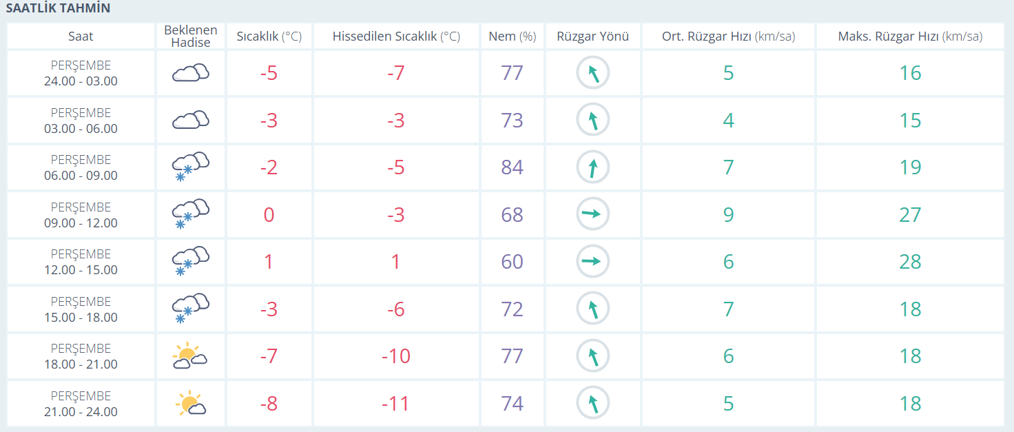 Bursa’da bugün kış şartları etkisini hissettiriyor. Perşembe günü gece saatlerinde hava çok bulutlu ve soğuk seyrederken sıcaklık eksi 5 dereceye kadar düşüyor. Sabah saatlerinden itibaren yer yer karla karışık yağmur ve hafif kar geçişleri görülüyor; hissedilen sıcaklık gün boyunca sıfırın altında kalıyor. Öğleye doğru termometreler 0–1 dereceyi gösterse de rüzgârın zaman zaman hızlanmasıyla soğuk daha sert hissediliyor. Akşam saatlerinden sonra yağış etkisini kaybediyor, hava parçalı bulutlu hale geliyor ve sıcaklık yeniden eksi değerlere inerek gece -8 dereceye kadar düşüyor.