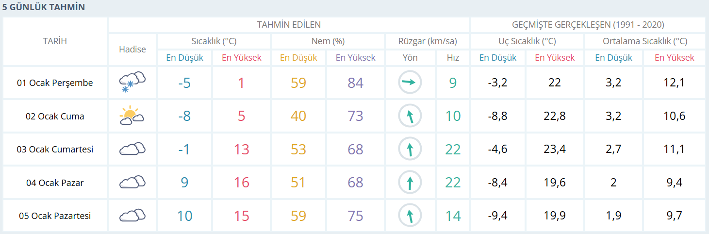 Önümüzdeki beş günlük süreçte Bursa’da hava dalgalı bir seyir izliyor. Cuma günü soğuk sabahın ardından gün içinde güneş yüzünü daha fazla gösteriyor ve sıcaklık 5 dereceye kadar yükseliyor. Cumartesi günü bulutlar artarken sıcaklıkta belirgin bir yükseliş yaşanıyor; günün en yüksek değeri 13 derece civarında. Pazar ve pazartesi günleri ise bulutlu bir gökyüzüyle birlikte mevsim normallerinin üzerinde sıcaklıklar dikkat çekiyor; gündüz saatlerinde 15–16 dereceler görülüyor. Rüzgâr özellikle hafta sonu zaman zaman etkisini artırsa da, genel olarak yağışsız ve daha ılık bir hava Bursa’da hakim olacak.