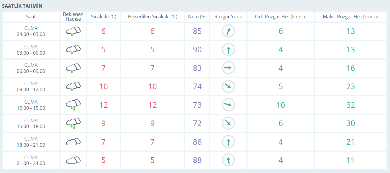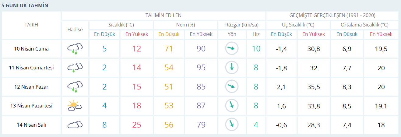 Önümüzdeki beş günlük periyotta ise şehirde yağışlı hava etkisini sürdürmeye devam edecek. Hafta sonuna kadar aralıklarla görülecek yağmurlar, sıcaklıkların mevsim normallerinin altında kalmasına neden olacak. Cumartesi ve pazar günleri en düşük sıcaklıkların 2 dereceye kadar gerilemesi beklenirken, gündüz saatlerinde 14–15 derece bandında değerler ölçülecek.