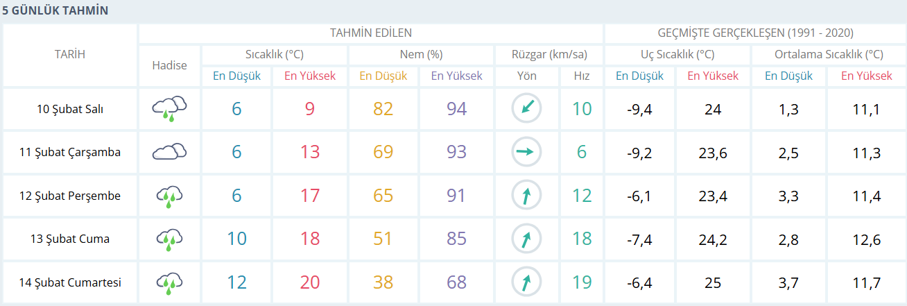 Önümüzdeki günlerde ise Bursa’da hava kademeli olarak ısınıyor. Çarşamba günü bulutlu bir gökyüzü hâkim olurken sıcaklık 13 dereceye kadar çıkıyor. Perşembe gününden itibaren yağış yeniden kendini gösteriyor ancak sıcaklık artışı daha belirgin; hafta ortasında 17 derece, cuma günü ise 18 derece civarında ölçülmesi bekleniyor. Hafta sonuna gelindiğinde yağışlı hava yer yer etkisini sürdürse de sıcaklık 20 dereceye yaklaşarak bahar havasını hissettiriyor. Nem oranı hafta boyunca giderek düşerken rüzgâr zaman zaman kuvvetleniyor, özellikle hafta sonuna doğru daha hissedilir esintiler Bursa genelinde etkili oluyor.