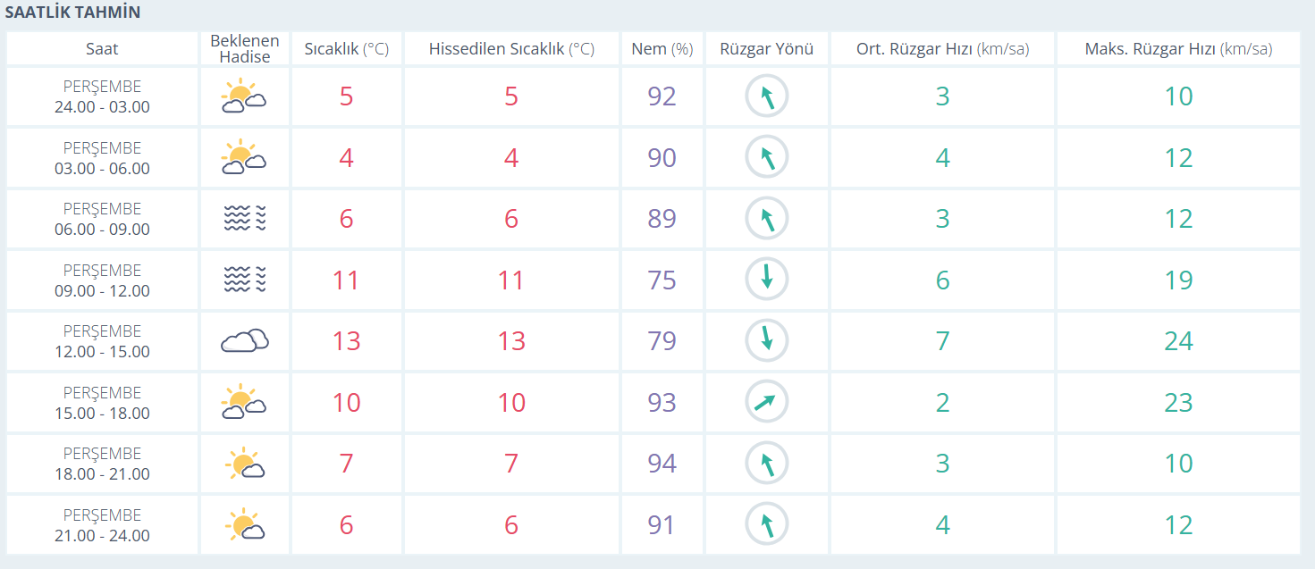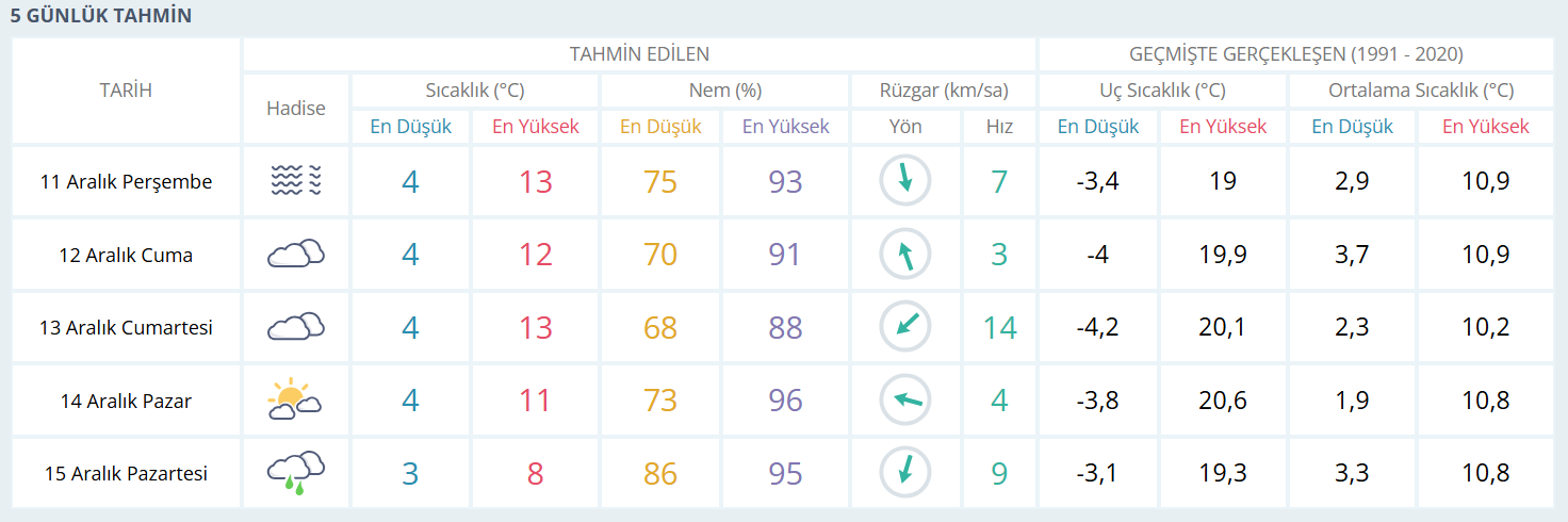 Kentte cuma ve cumartesi günleri çok bulutlu bir hava öne çıkarken, pazar günü kısa süreli güneş görülecek. Haftanın son günü olan pazartesi ise hafif yağış ihtimaliyle beraber sıcaklık 8 dereceye kadar düşecek. Nem oranlarının hafta boyunca yüksek seyretmesi nedeniyle sabah ve akşam saatlerinde sis ve pus etkisini sürdürecek.