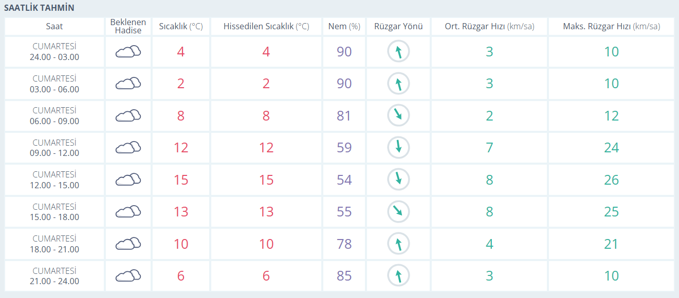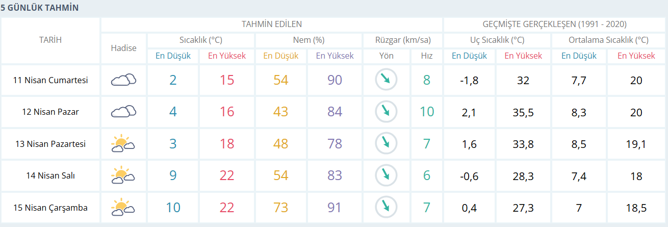 Pazar günü ise benzer bir hava etkisini sürdürüyor. En düşük sıcaklık 4, en yüksek sıcaklık 16 dereceye çıkarken, nem oranındaki düşüşle birlikte hava biraz daha rahat hissediliyor. Rüzgar hızında küçük bir artış görülse de genel olarak sakin bir gün bekleniyor.