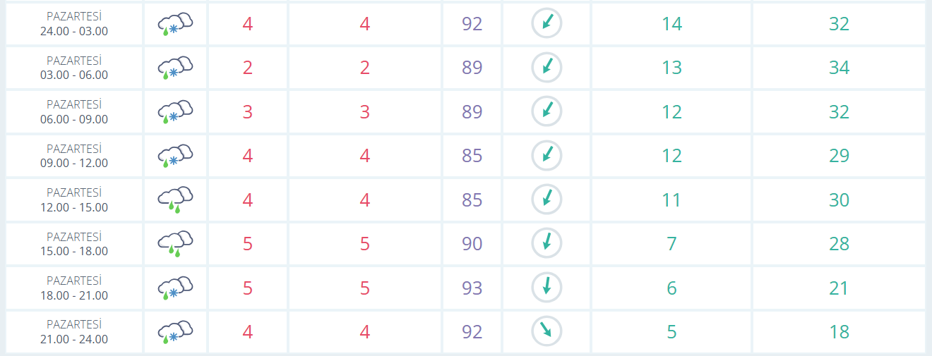 Bursa’da yeni haftayla birlikte yağışlı ve serin hava etkisini gösteriyor. Pazartesi günü kent genelinde gün boyu aralıklarla yağmur beklenirken, sıcaklık 2 ile 5 derece arasında seyredecek. Nem oranının oldukça yüksek olacağı günde rüzgâr kuzeyli yönlerden saatte yaklaşık 13 kilometre hızla esecek. Akşam saatlerine doğru yağışın yer yer kuvvetlenmesi, geceye doğru ise sıcaklığın hissedilir biçimde düşmesi öngörülüyor.