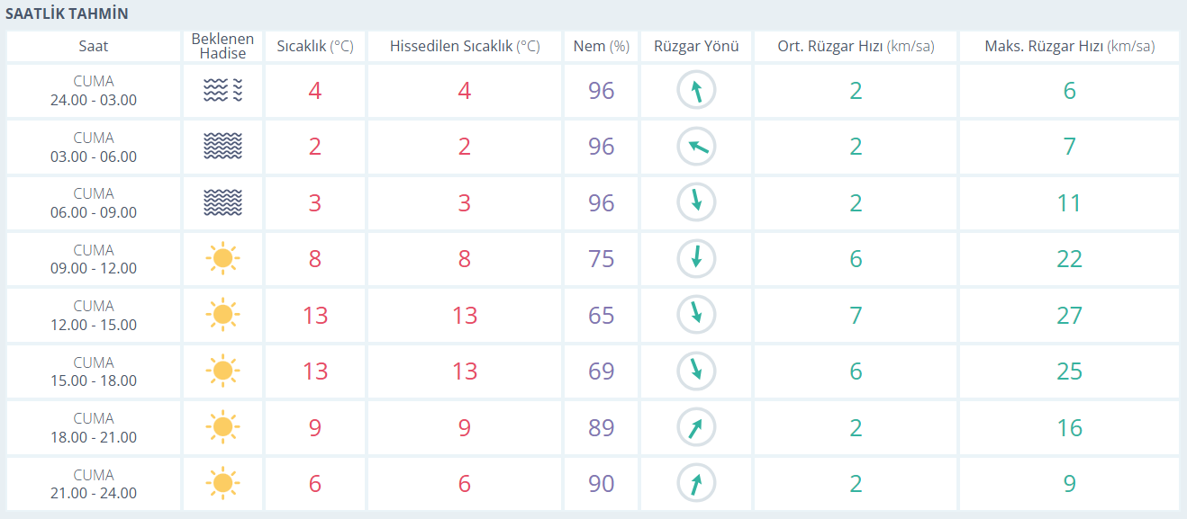 Bursa için yapılan son tahminlere göre kentte hafta sonuna doğru sıcaklıklar kademeli olarak artarken, gün içinde güneşli saatler de çoğalacak. Cuma günü gece saatlerinden sabaha kadar yoğun nemin etkisiyle sisli bir hava bekleniyor. Gece sıcaklığı 2–4 derece civarında seyrederken nem oranı yüzde 96’ya kadar çıkıyor. Sabah saatlerinden sonra sisin dağılmasıyla birlikte hava açacak ve güneş yüzünü gösterecek. Öğle saatlerinde sıcaklık 13 dereceye kadar yükselirken günün en sıcak saatleri öğleden sonra olacak. Akşam saatlerinde ise sıcaklık yeniden düşerek geceye doğru 6 dereceye kadar gerileyecek.