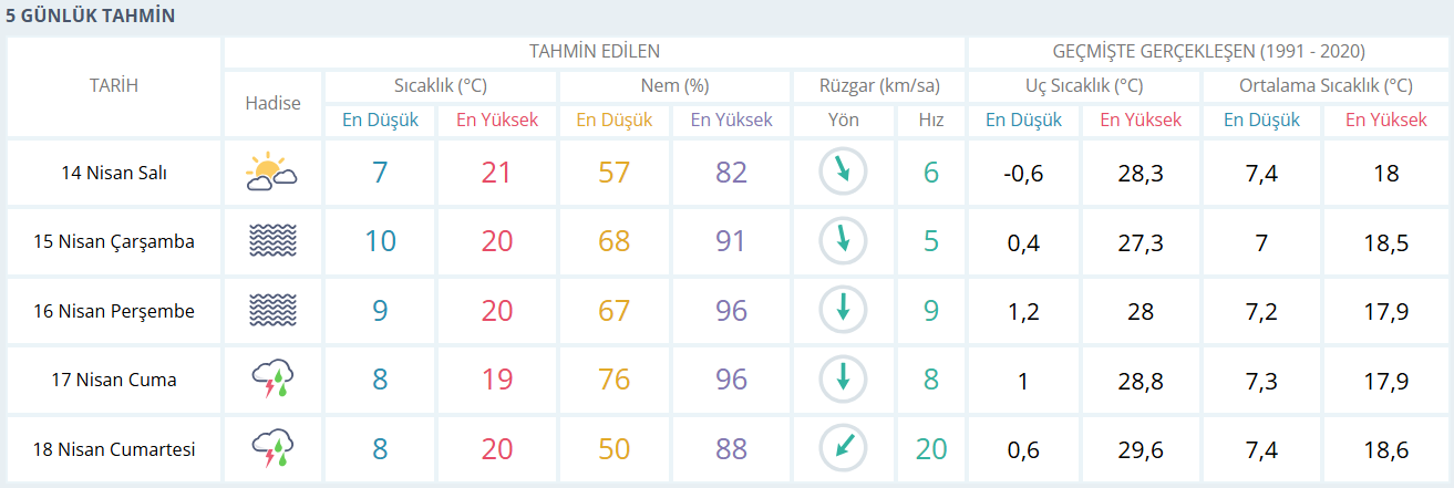 Çarşamba gününden itibaren ise hava durumunda belirgin bir değişim görülüyor. 15 ve 16 Nisan’da nem oranının yükselmesiyle birlikte gökyüzü daha kapalı olacak. Sıcaklıklar 20 derece civarında seyretmeye devam etse de atmosferdeki yoğunluk, zaman zaman puslu ve bunaltıcı bir hissiyat oluşturabilir.