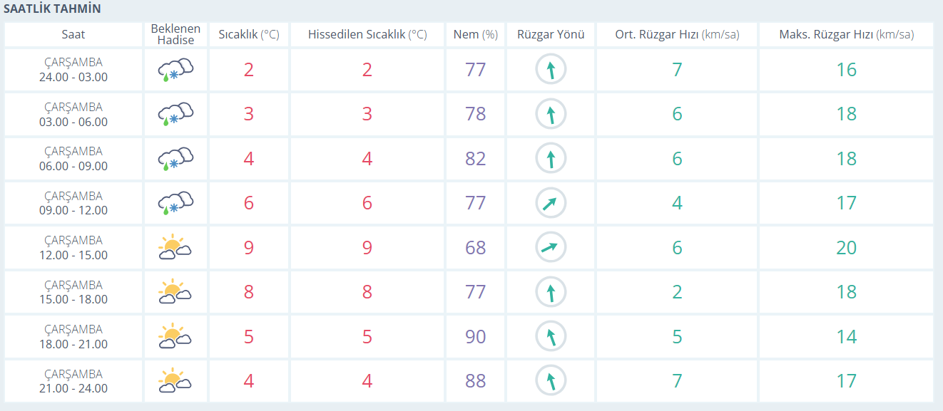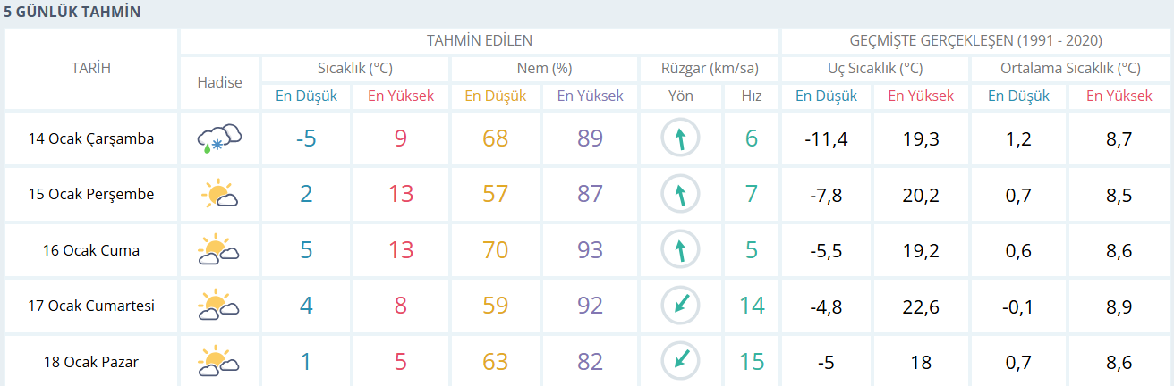 Perşembe ve cuma günleri sıcaklıklarda belirgin bir artış bekleniyor. Gündüz sıcaklıklarının 13 dereceye kadar yükselmesi, geceleri ise sıcaklığın 2–5 derece aralığında seyretmesi öngörülüyor. Hafta sonuna doğru hava parçalı bulutlu olacak, rüzgârın zaman zaman kuvvetlenmesi beklenirken sıcaklıkların yeniden bir miktar düşerek pazar günü 5 derece civarına gerileyeceği tahmin ediliyor.