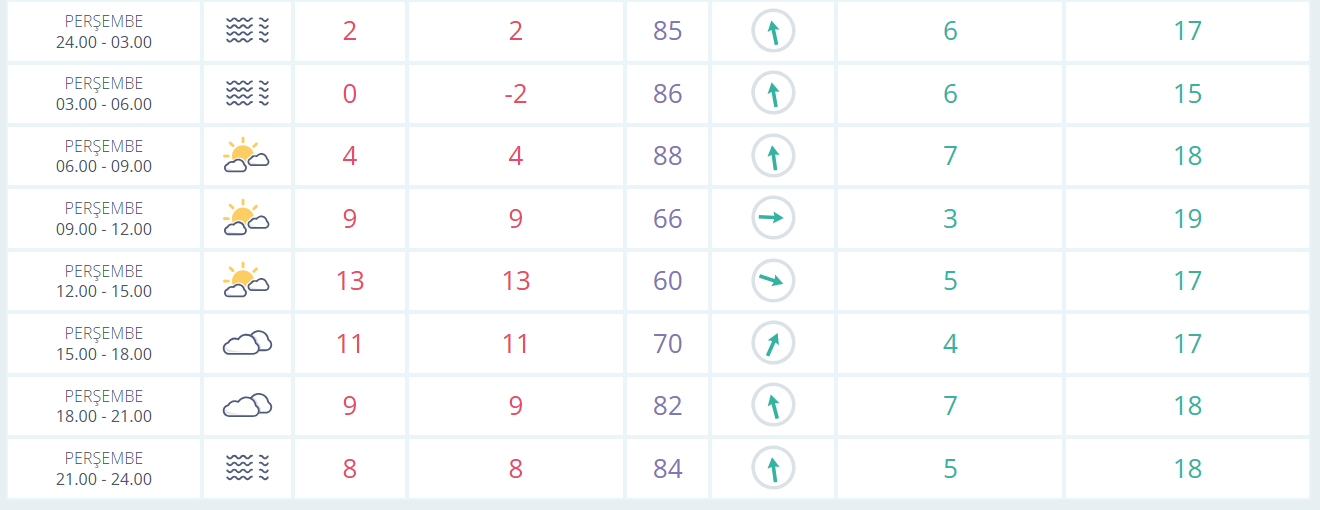 Bursa’da bugün hava parçalı bulutlu seyrederken, sabah ve gece saatlerinde yer yer pus etkili oluyor. Gece yarısından sonra sıcaklık 2 derece civarında ölçülürken, sabaha karşı sıfırın altına düşerek 0 dereceye kadar geriliyor. Sabah saatlerinde hava yavaş yavaş ısınmaya başlıyor ve öğleye doğru sıcaklık 9 dereceye yükseliyor. Günün en sıcak saatleri olan öğle ve öğleden sonra ise termometreler 12–13 dereceyi gösteriyor. Akşam saatlerinden itibaren sıcaklık yeniden düşüşe geçerken, geceye doğru nem oranı artıyor. Rüzgâr gün boyunca hafif ve zaman zaman orta kuvvette esiyor.