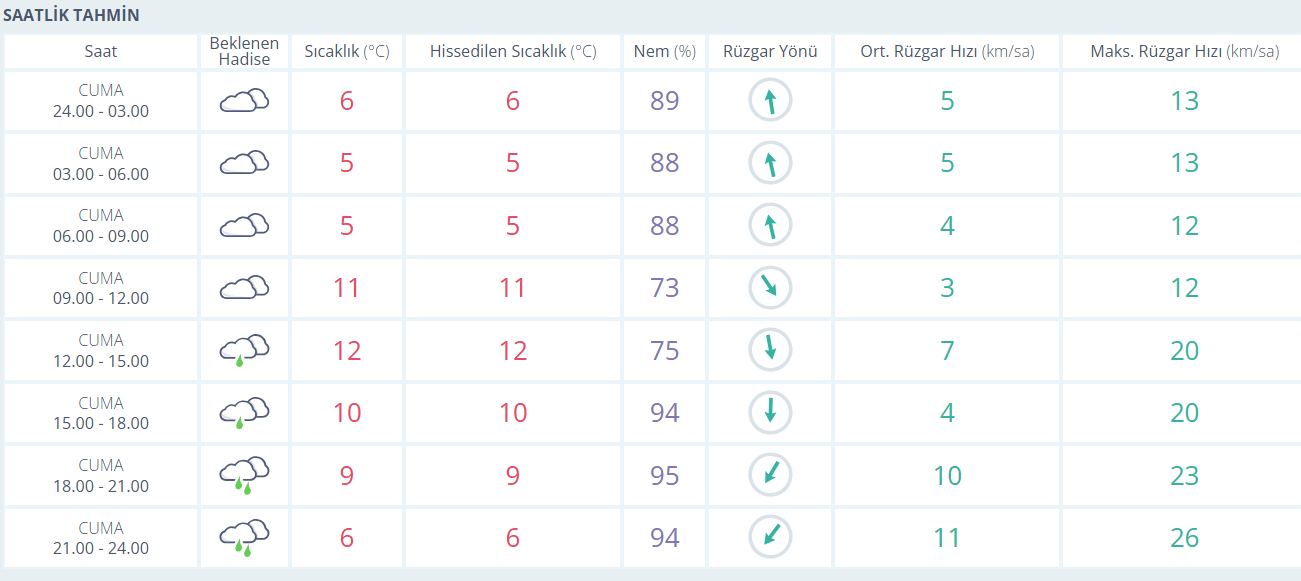 Bursa’da bugün (16 Ocak Cuma) hava gün boyunca çok bulutlu ve aralıklı yağışlı geçiyor. Sabah saatlerinde 5–6 derece civarında seyreden sıcaklık, öğleye doğru 11–12 dereceye kadar yükseliyor. Öğleden sonra ve akşam saatlerinde yağış etkisini artırırken nem oranı oldukça yüksek seyrediyor. Rüzgâr genellikle hafif ve orta kuvvette, zaman zaman kuvvetli esintiler hissedilebiliyor. Akşam saatlerinden itibaren sıcaklık yeniden düşüşe geçerek gece saatlerinde 6 derece civarına iniyor.
