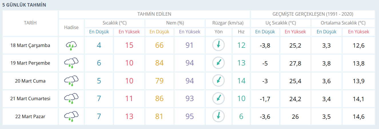 Bursa’da hava önümüzdeki günlerde bahar ile kış arasında gidip gelen bir tablo çizecek. 18 Mart Çarşamba günü şehirde yağmur etkili olurken sıcaklıklar gün içinde 15 dereceye kadar yükseliyor, gece ise 4 dereceye kadar düşüyor. Nem oranının yüksek seyretmesi ve zaman zaman kuvvetlenen rüzgâr, hissedilen sıcaklığı biraz daha aşağı çekiyor. Günün özellikle öğle saatlerinden itibaren yağışın belirginleşmesi beklenirken, rüzgârın zaman zaman sert esmesi dikkat çekiyor.