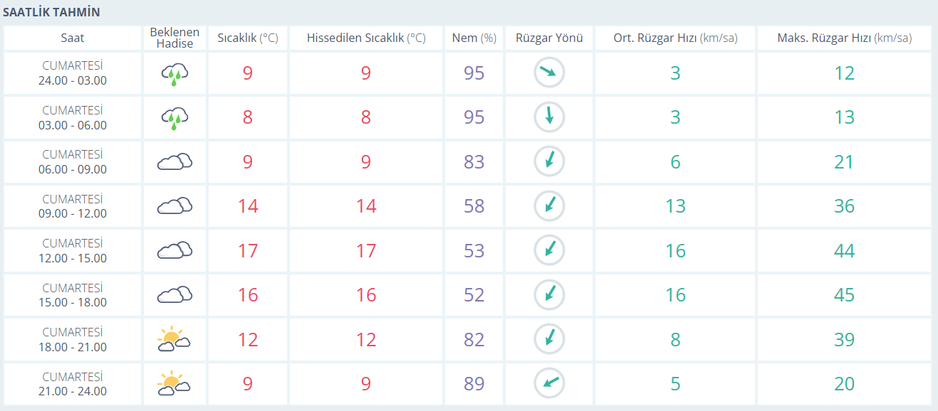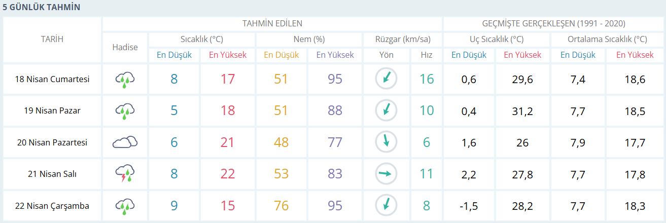 Beş günlük görünümde ise yağışlı hava etkisini tamamen kaybetmiyor. Cumartesi günü en düşük 8, en yüksek 17 derece beklenirken, pazar günü sabah daha serin bir hava ile 5 derece ölçülüyor ancak gün içinde sıcaklık 18 dereceye kadar çıkıyor. Haftanın ilk günü olan pazartesi, bulutlu bir gökyüzüyle birlikte daha ılık bir tablo sunuyor ve sıcaklık 21 dereceye ulaşıyor. Salı günü ise yer yer gök gürültülü sağanak yağış geçişleri beklenirken sıcaklık 22 dereceye kadar yükseliyor. Haftanın ortasında yağış yeniden etkisini artırıyor; çarşamba günü sıcaklıklar belirgin şekilde düşerek en fazla 15 dereceye çıkıyor.