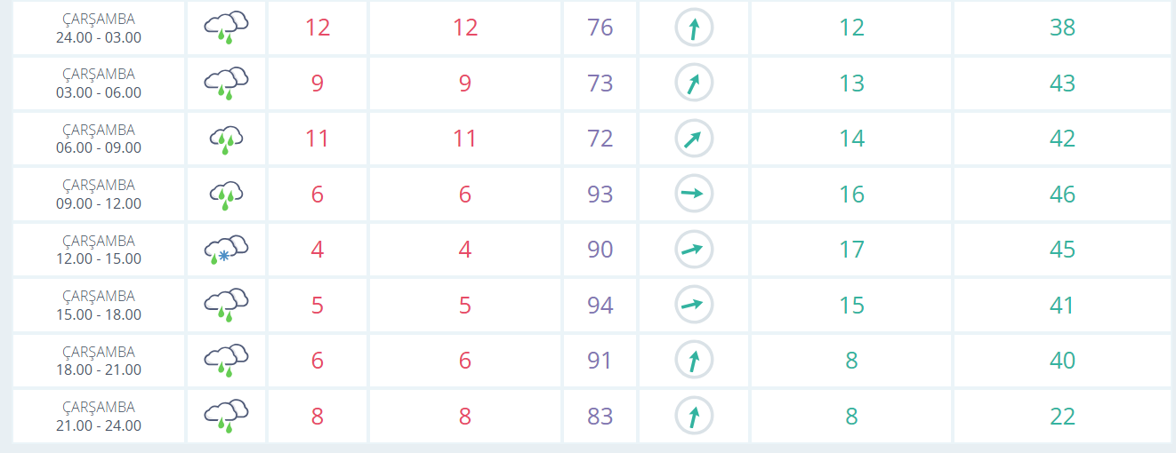 Bursa’da Çarşamba günü kent genelinde yağışlı hava etkisini gösterecek. Gece saatlerinden itibaren görülen yağmur, sabah ve öğle saatlerinde de aralıklarla sürecek. Gün içinde sıcaklık 9 ila 11 derece arasında seyrederken, nem oranı yüzde 90’lara kadar çıkacak. Rüzgârın zaman zaman saatte 15–17 kilometre hıza ulaşması bekleniyor. Akşam saatlerinde yağışın hafiflemesi öngörülse de bulutlu ve nemli hava etkisini koruyacak.