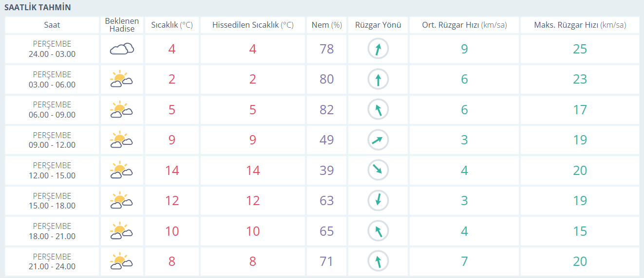 Cuma günü kentte sıcaklık artışı dikkat çekiyor. En düşük 3, en yüksek 20 derece beklenirken hava yine parçalı bulutlu olacak. Hafta sonuna girerken ise tablo değişiyor. Cumartesi günü sıcaklık 7 ile 14 derece arasında seyredecek ve yağış etkili olacak. Nem oranının yükselmesiyle birlikte yer yer kuvvetli yağmur görülebilir.
