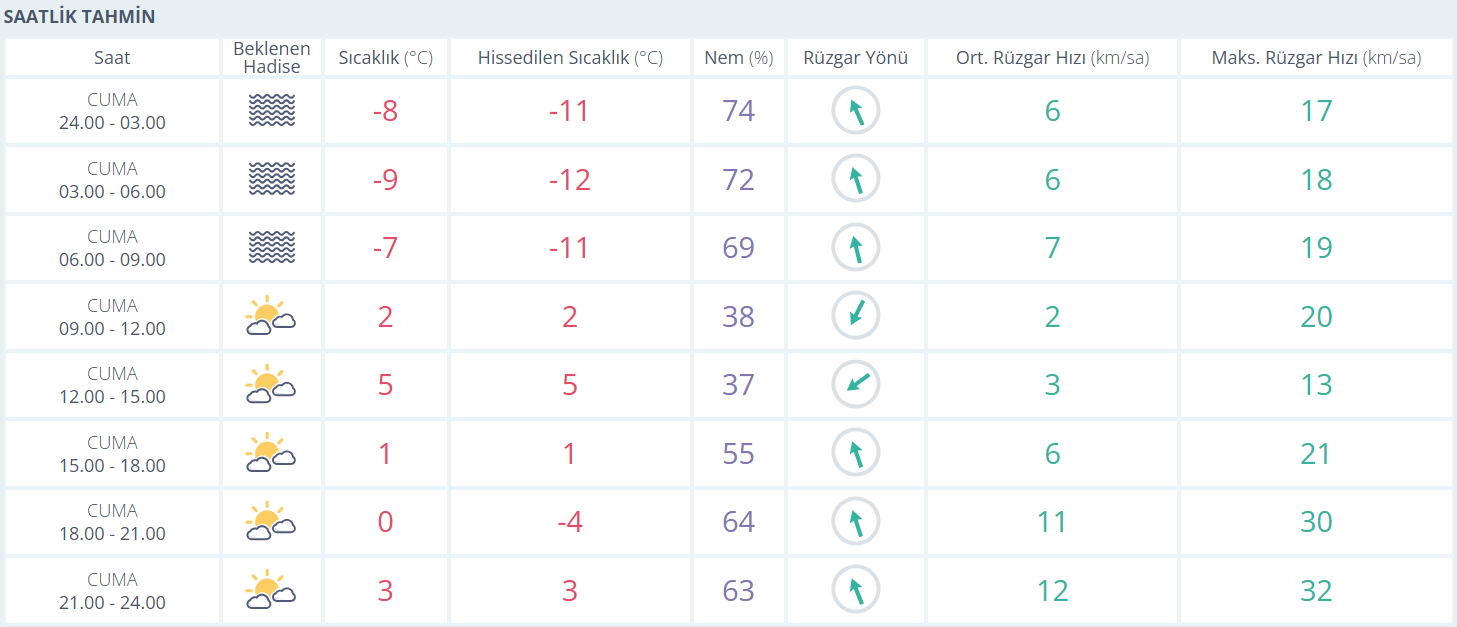 Bursa’da bugün kışın sert yüzü özellikle gece ve sabah saatlerinde hissediliyor. Gece yarısından sonra sıcaklık eksi 8–9 derecelere kadar düşerken hissedilen sıcaklık yer yer eksi 12 dereceyi buluyor. Sabah saatlerine doğru soğuk etkisini sürdürse de öğleye yaklaşırken hava açıyor ve sıcaklık hızla yükseliyor. Gün ortasında parçalı bulutlu bir gökyüzüyle birlikte termometreler 5–6 dereceyi gösteriyor. Öğleden sonra sıcaklık yeniden düşüşe geçerken akşam saatlerinde rüzgâr zaman zaman kuvvetleniyor; hissedilen sıcaklık sıfırın altına iniyor. Gün genelinde nem oranı yüksek seyrediyor.
