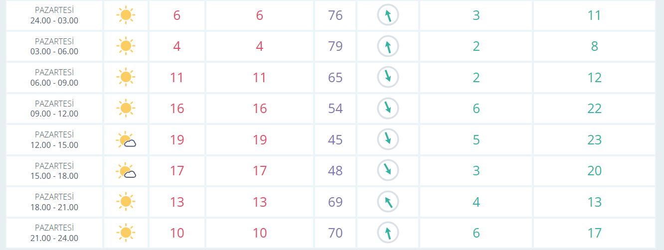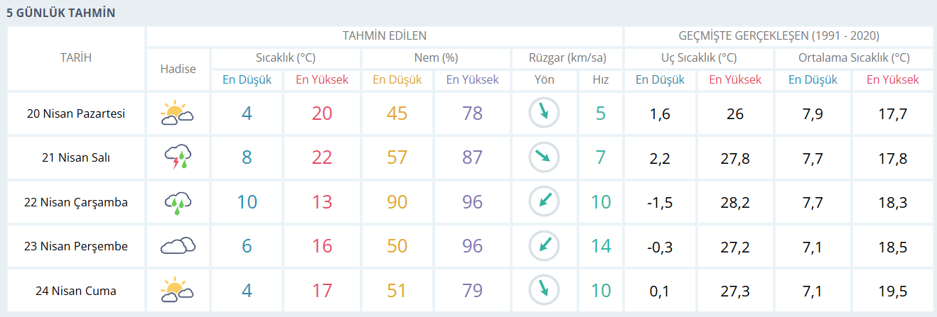 Haftanın devamında ise hava koşullarında belirgin değişimler dikkat çekiyor. Salı günü parçalı bulutlu bir gökyüzüne yer yer gök gürültülü sağanak yağış eşlik ederken sıcaklık 22 dereceye kadar çıkıyor. Çarşamba günü yağışın etkisi artıyor; sıcaklıklar 13 dereceye kadar gerilerken nem oranı oldukça yükseliyor. Perşembe günü bulutlu bir hava öne çıkıyor, sıcaklık 16 derece civarında seyrediyor. Cuma günü ise yeniden parçalı bulutlu ve daha ılıman bir hava bekleniyor; en yüksek sıcaklığın 17 derece olması öngörülüyor.